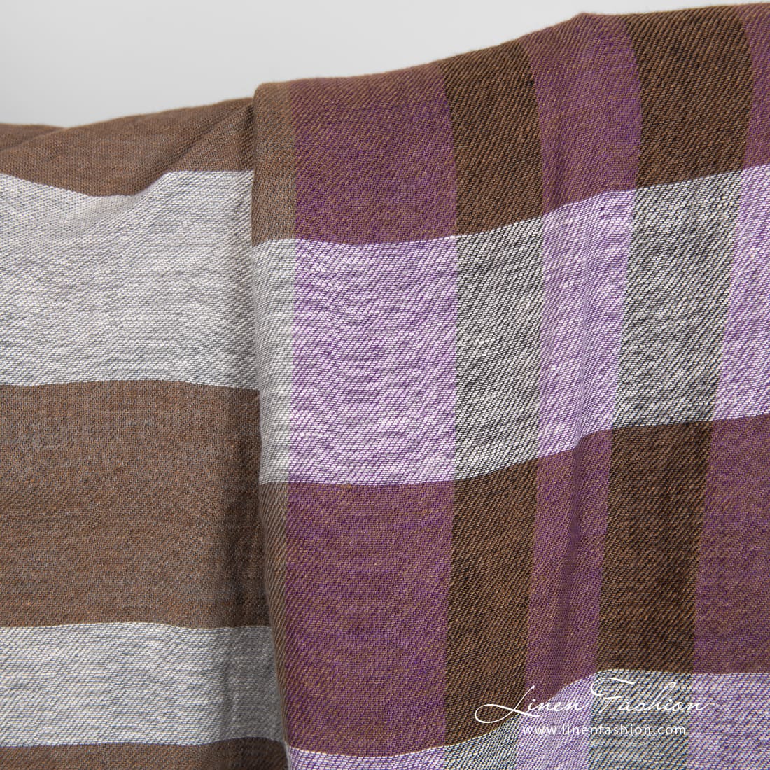 Linstoff i fiolette og brune striper vasket