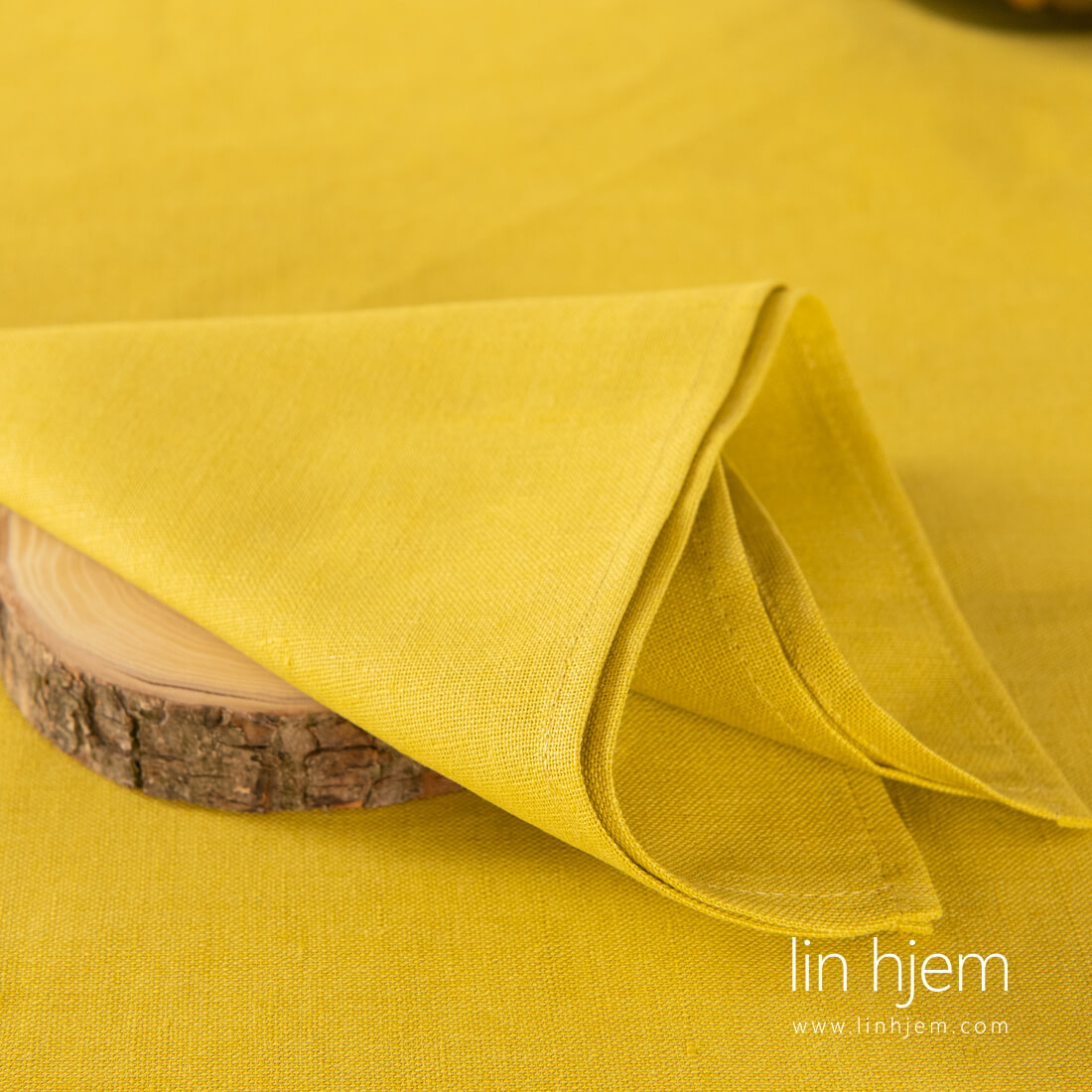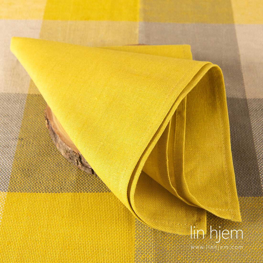 Gul serviett i halvlin som passer perfekt til duk av samme stoff og farge. Kan kombineres også med grå-gul rutete duker. Finnes i 4 forskjellige størrelser så dere finner en som passer best til spisebordet deres.