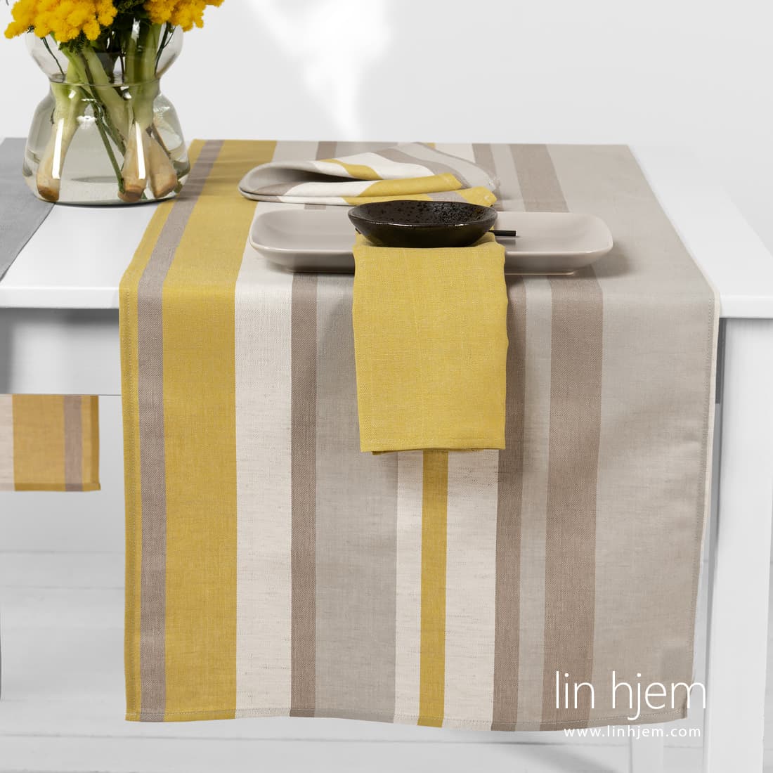 • MIMOSA grå-gul stripete halvlin bordløper og gule servietter