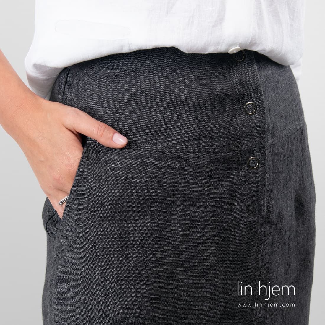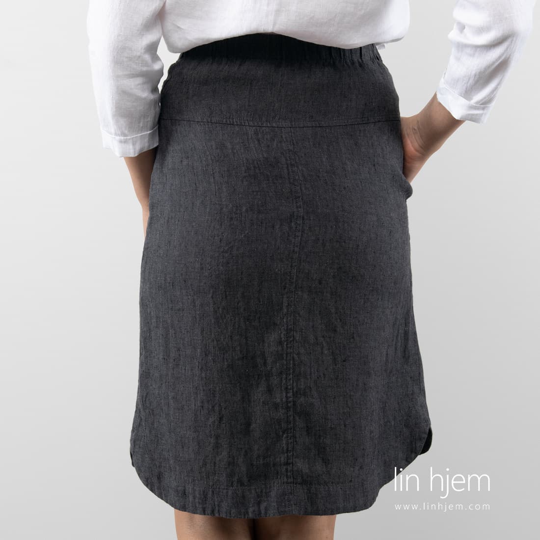 Svart linskjørt "minis". Produktets stoff er ensfarget melange stoff som ble vevd av svarte og mørkegrå garn. På grunn av sin universell farge kan dette linskjørtet kombineres med bluser, skjorter, t-skjorter i alle farger.