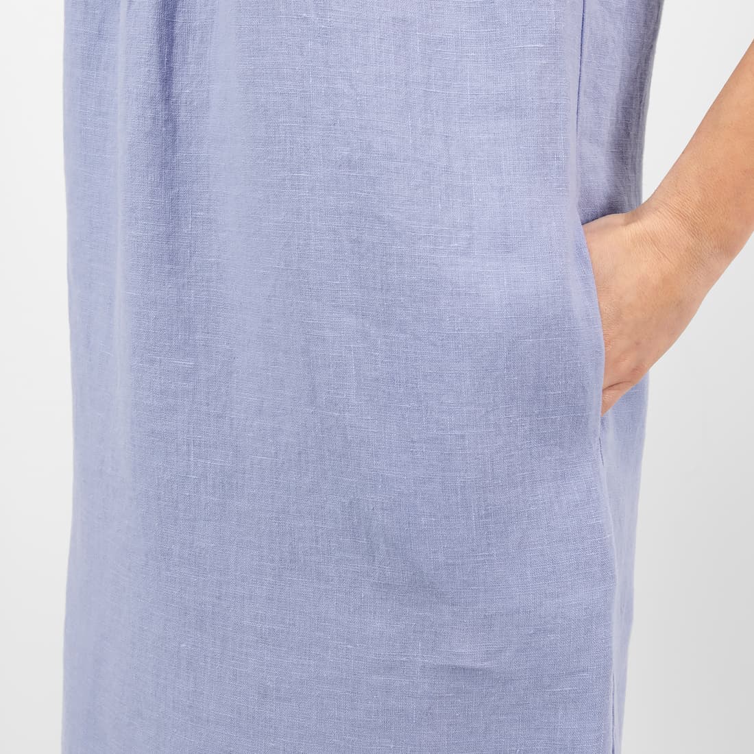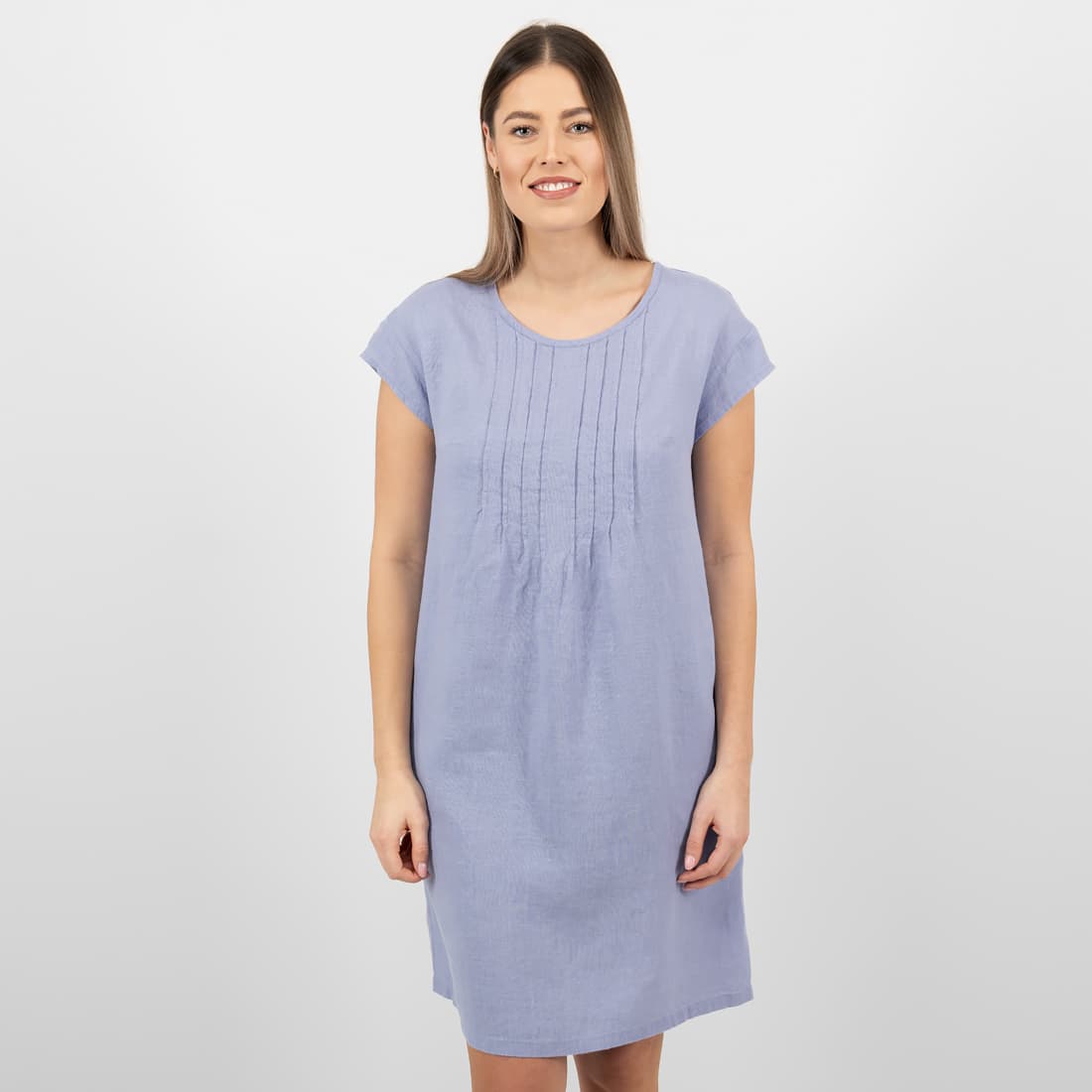 - Detaljer: korte ermer, rund hals, plissering foran, lommer, knappelukking bak