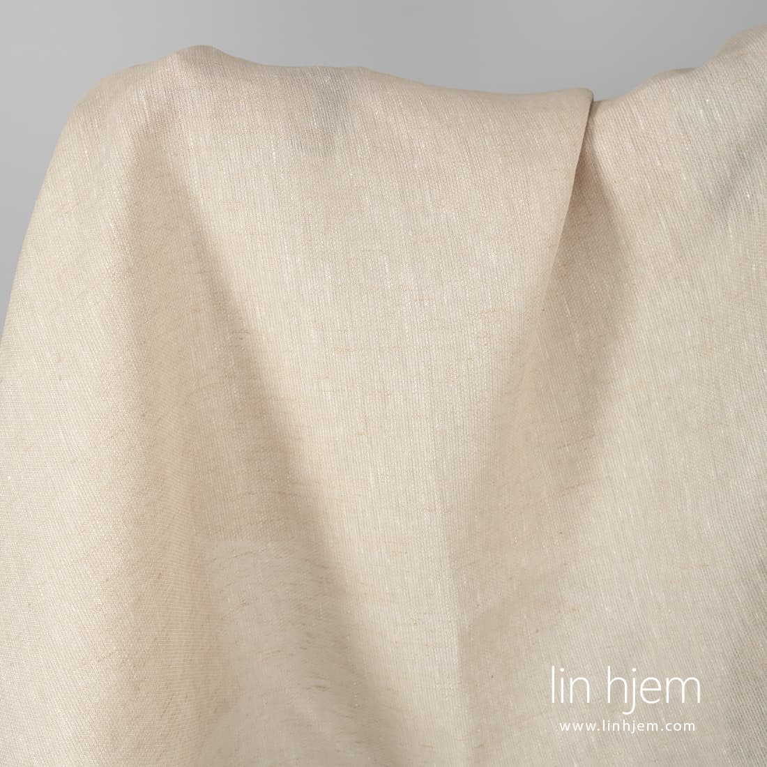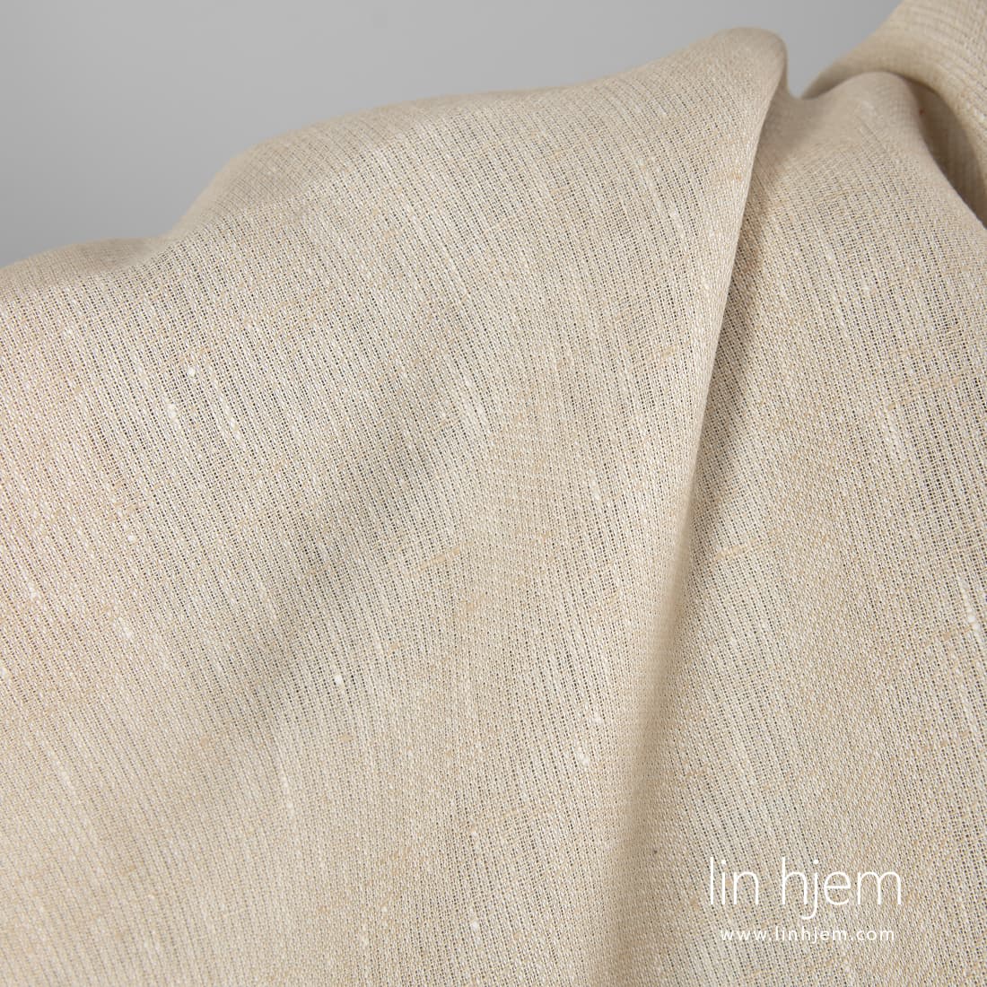 Mønstret beige linstoff vevd i vertikale striper av hvite og rødaktige lingarn. Holdbart, tettvevd, middels tykkelse. Sy klær og hjem tekstil produkter av dette 100% linstoffet.