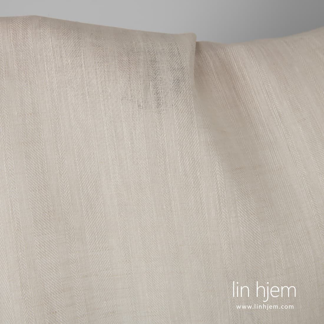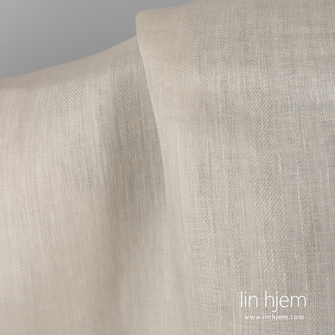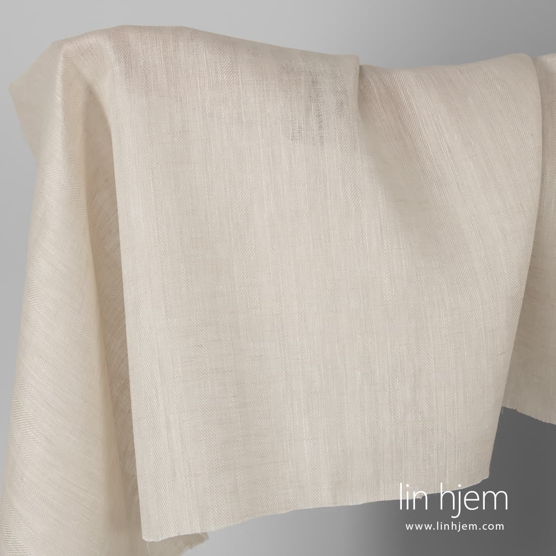 Mønstret brunaktig gult linstoff vevd av gulaktig hvite og gråaktig brune garn. Dekorert med vertikale "gran" mønster striper. Lett, tettvevd, middels tykkelse stoff som passer til å sy klær eller hjem tekstil produkter.