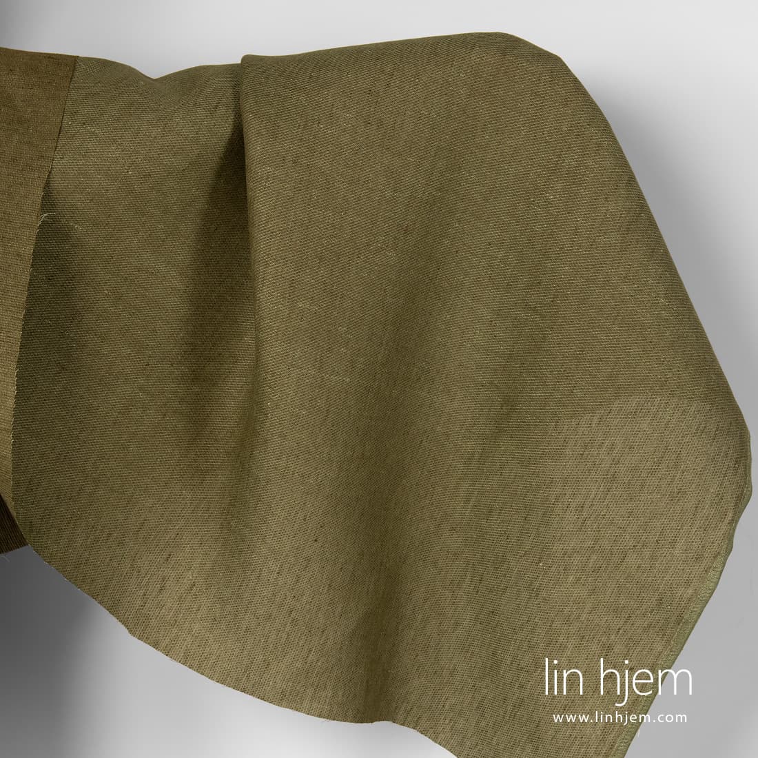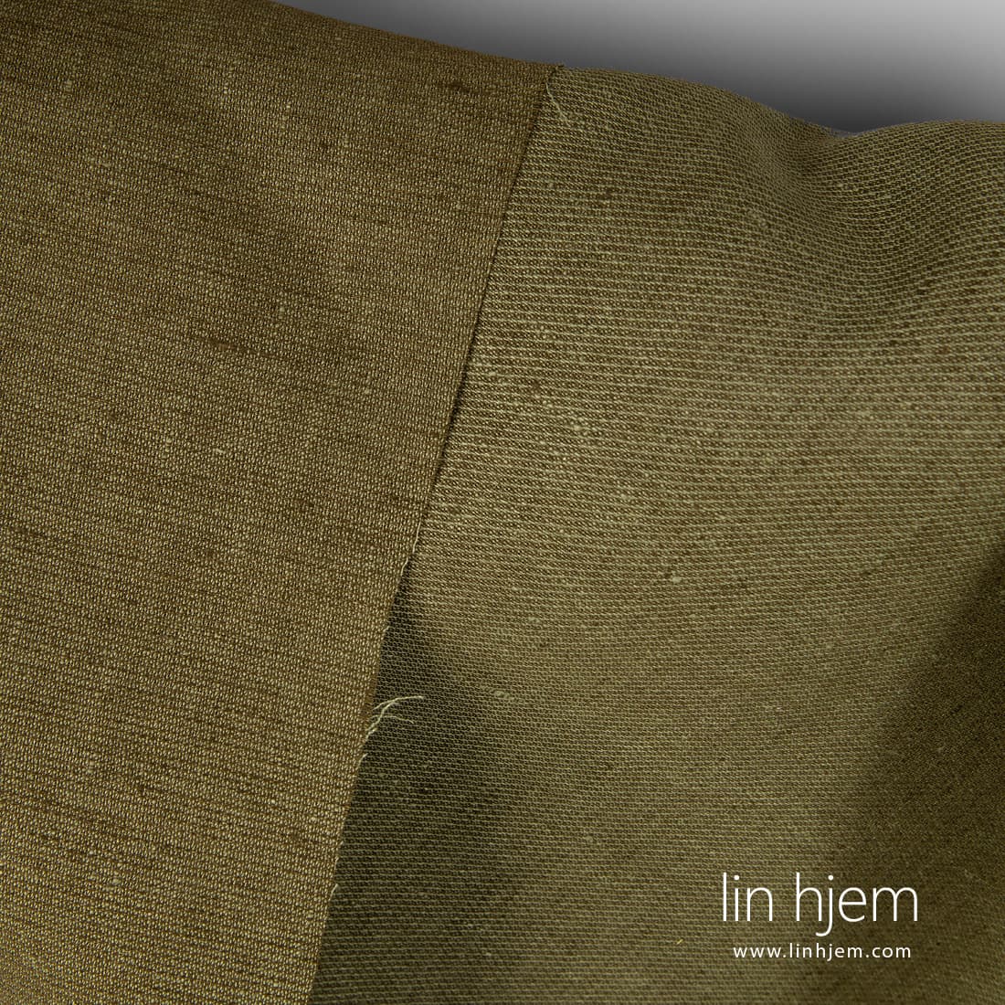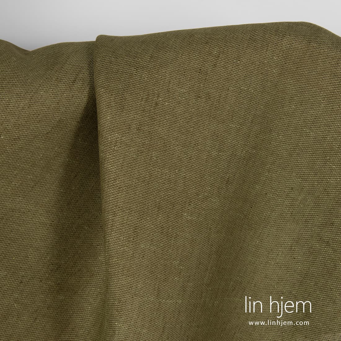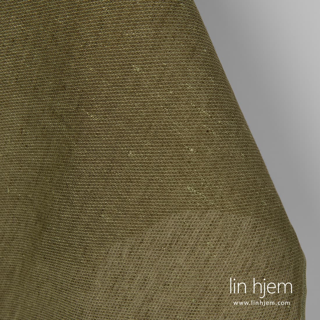 Mønstret grønt linstoff vevd i fint mønster av brun-grønne ig gråaktig grønne garn. Tettvevd, holdbart, middels tykkelse stoff som passer til å sy klær, hjem tekstil produkter (duker, gardiner, forklær).