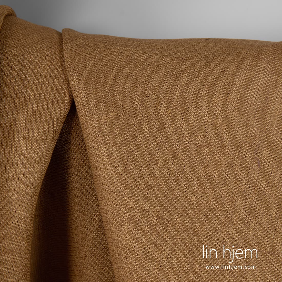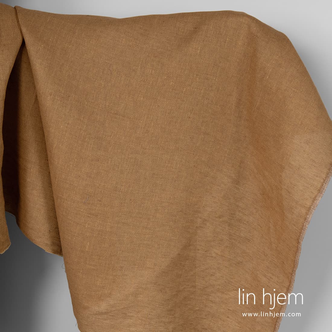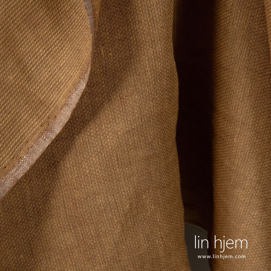 Mønstret linstoff i brun. Holdbart, tettvevd, middels tykkelse stoff som ble vevd i fint mønster av rødaktig gule og brune garn. Dette stoffet passer til å sy klær, gardiner, duker, servietter, putetrekk.