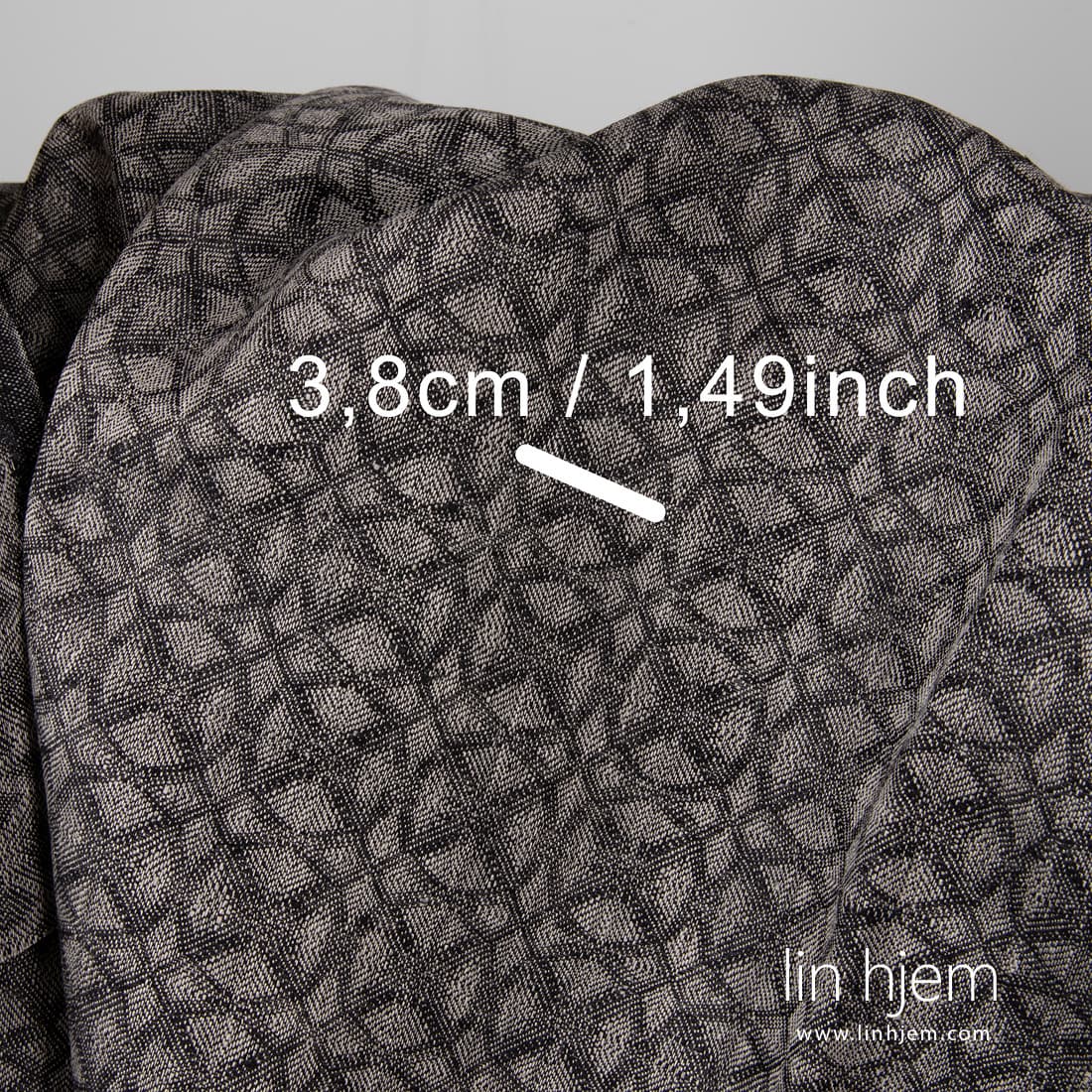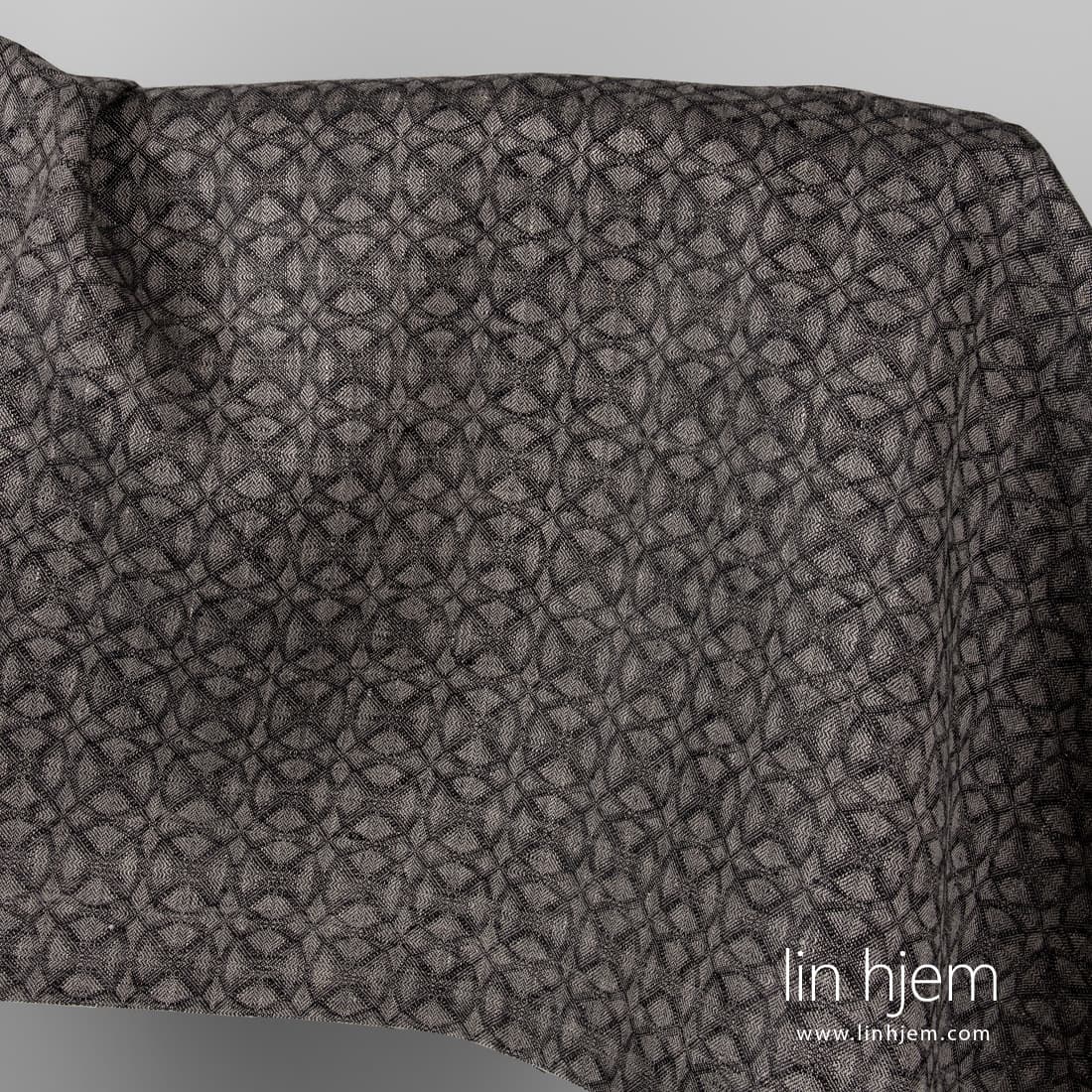 Mønstret linstoff i grå/svart farge vevd fra naturlig (ufarget) og svarte garn. Dette linstoffet er holdbart, tettvevd, middels tykkelse. Passer til å sy gardiner, duker, putetrekk og klær.