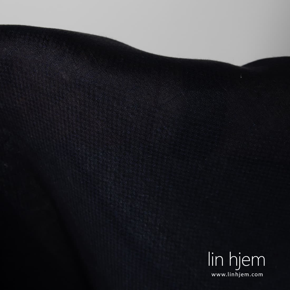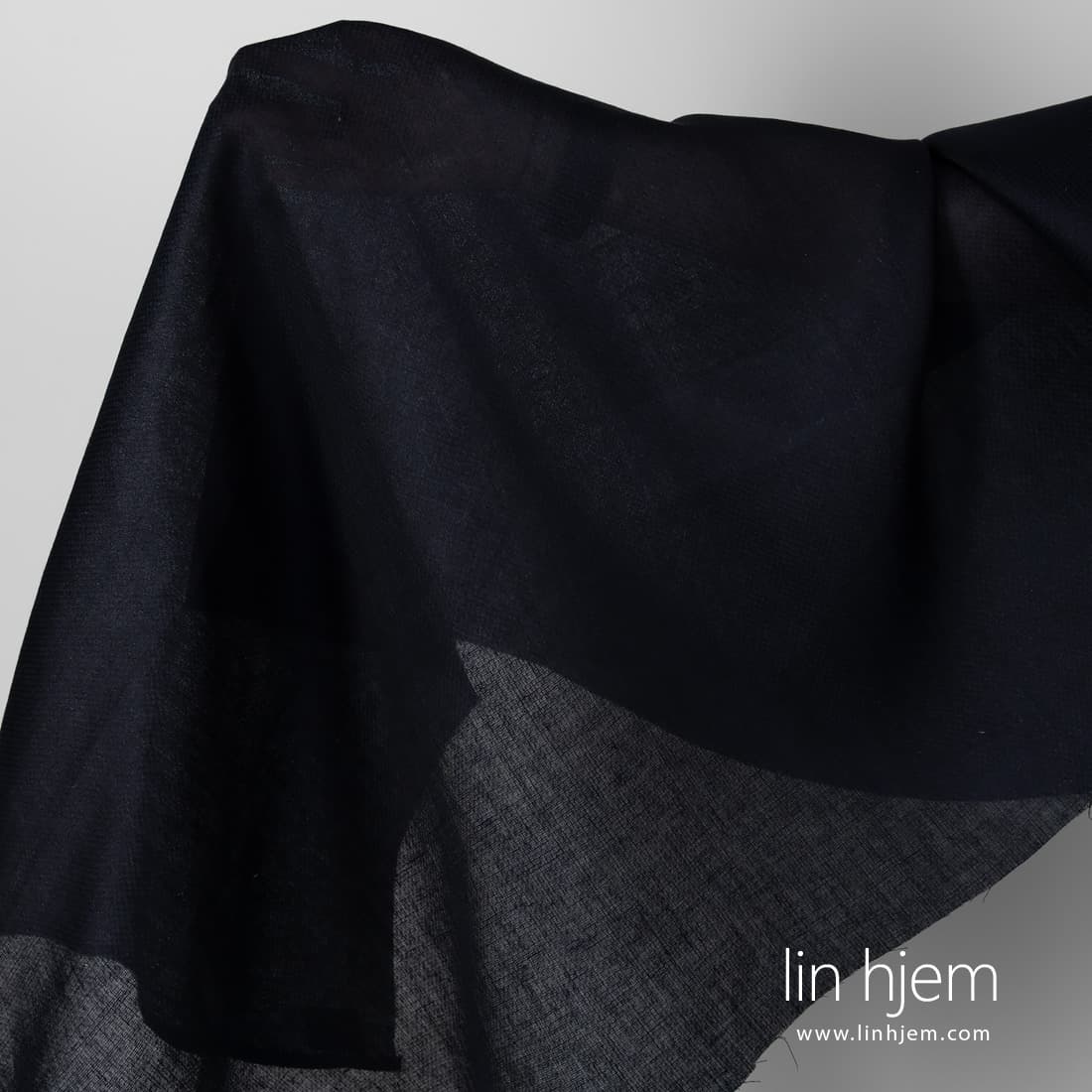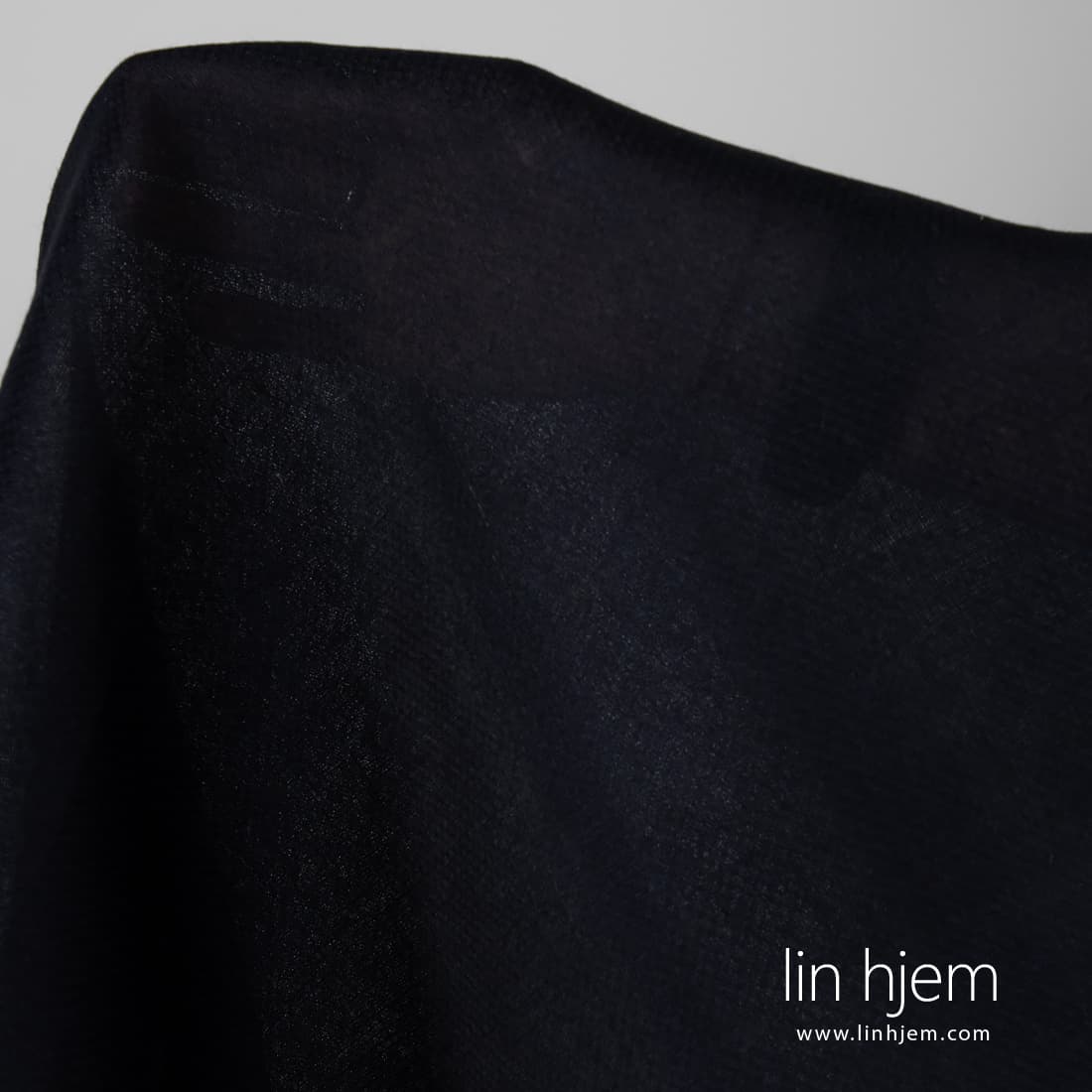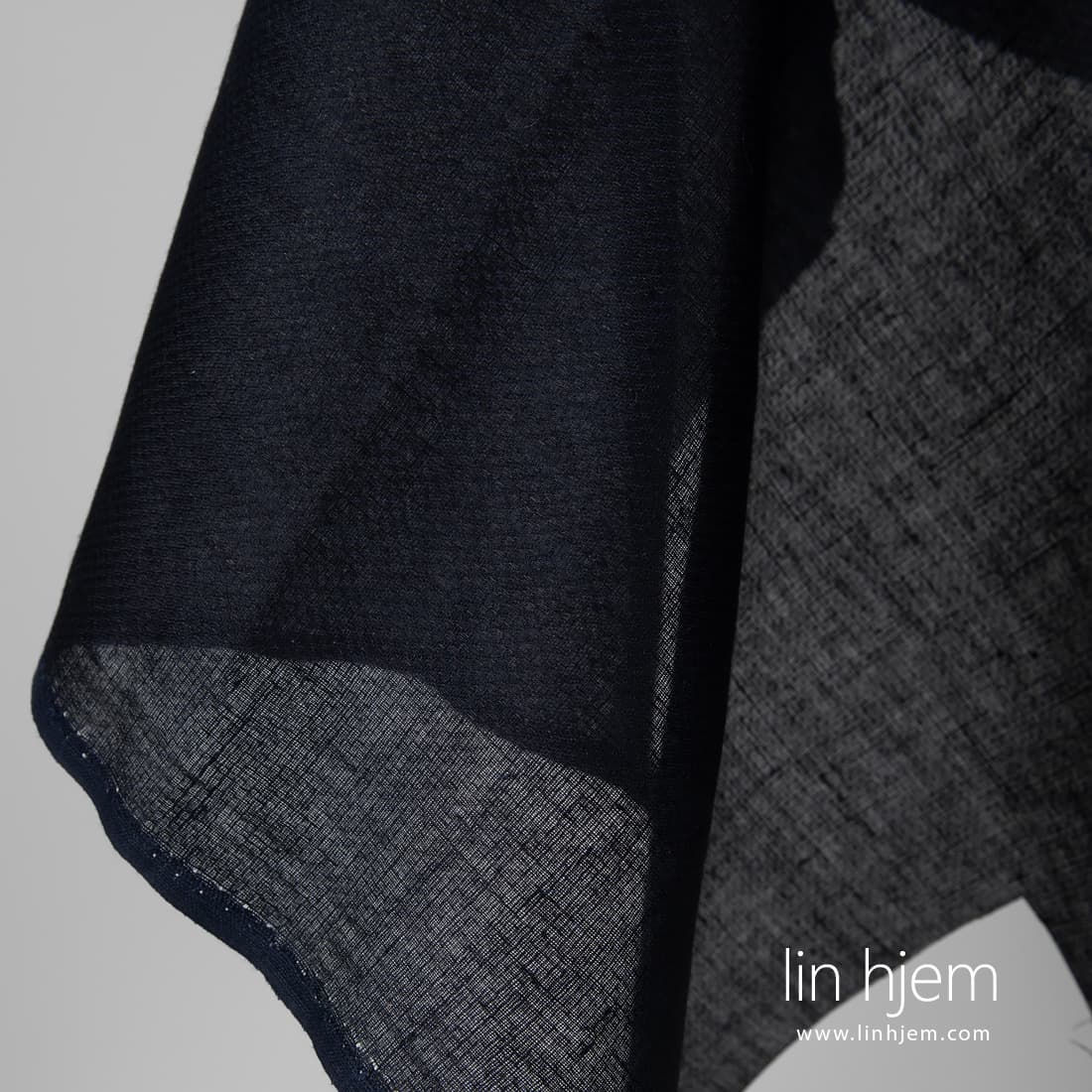 Mønstret mørkeblått linstoff vevd i små mønster av mørkeblå og svarte garn. Lett, tettvevd, litt gjennomsiktig.