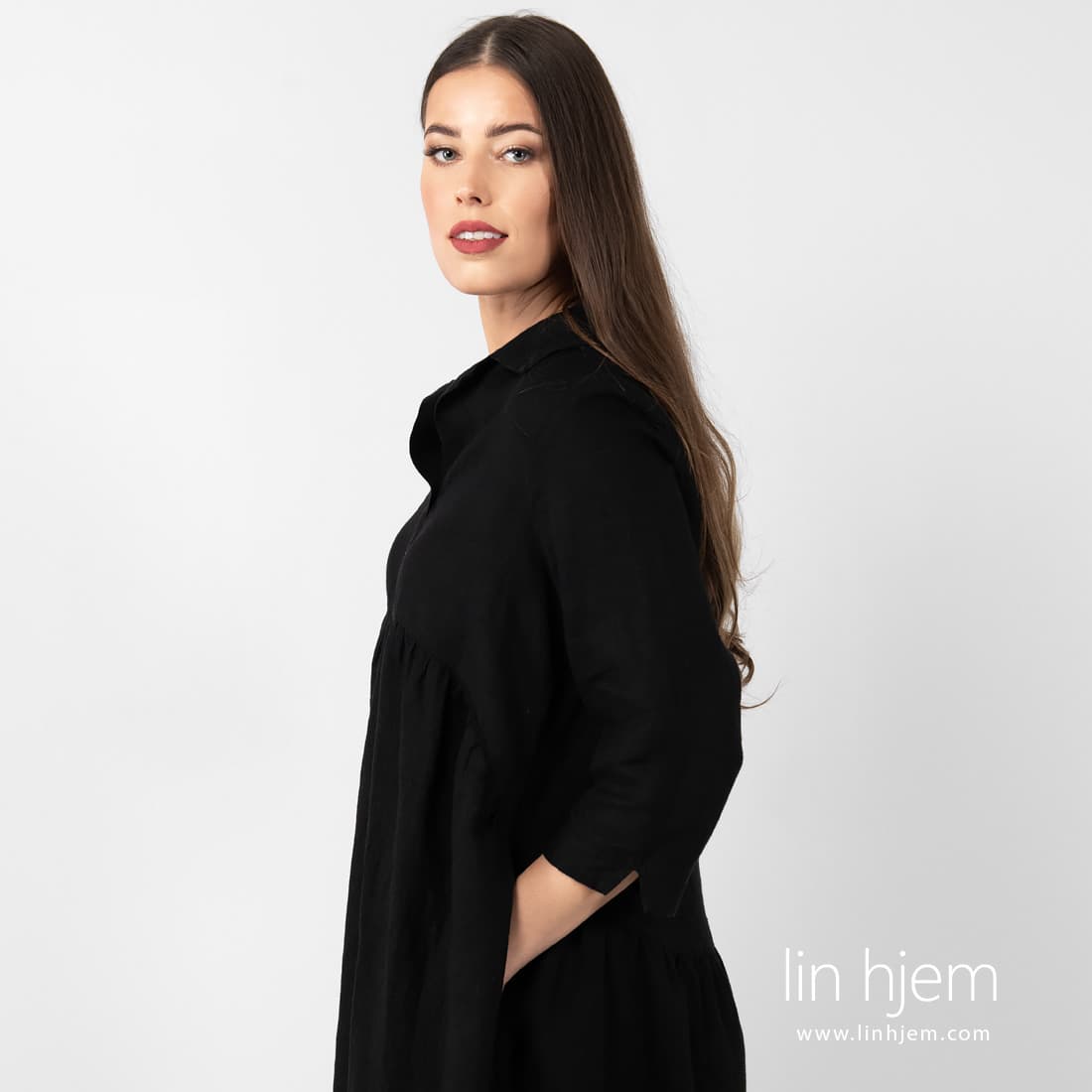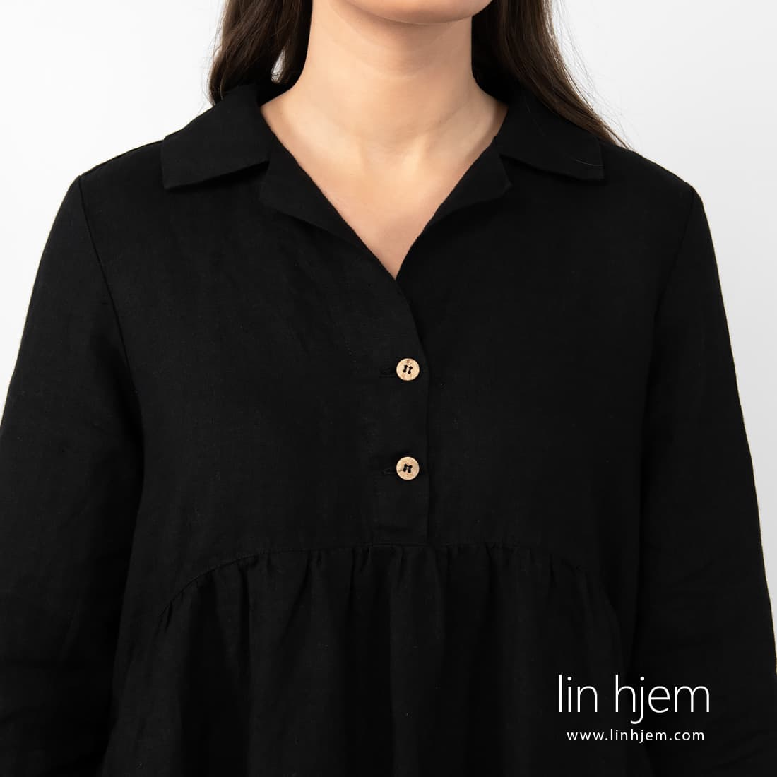 - Detaljer: knapper i front, rynket under brystet, 3/4 ermer, lommer