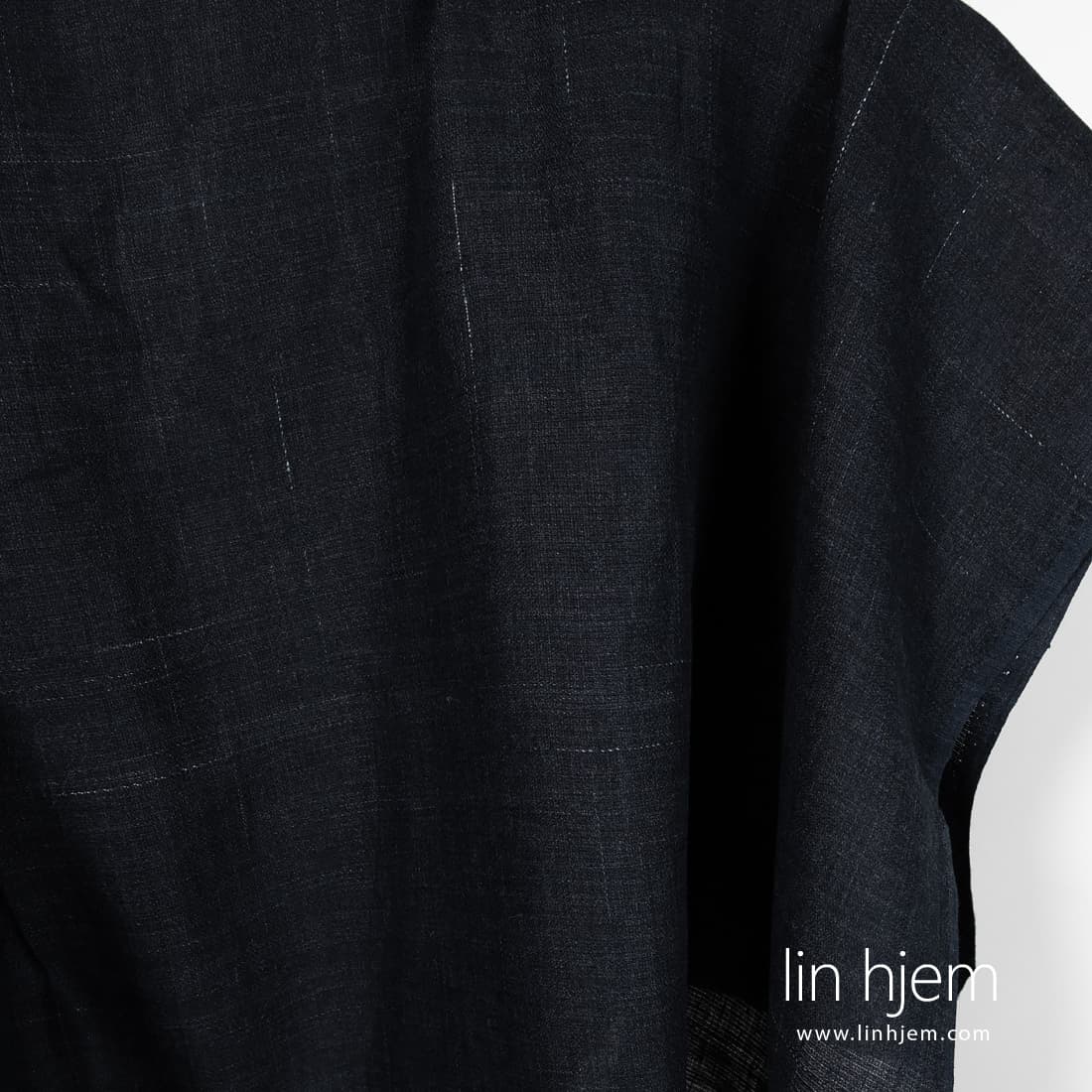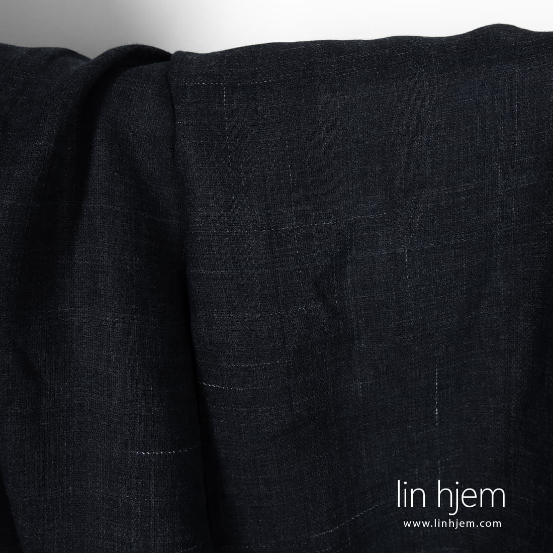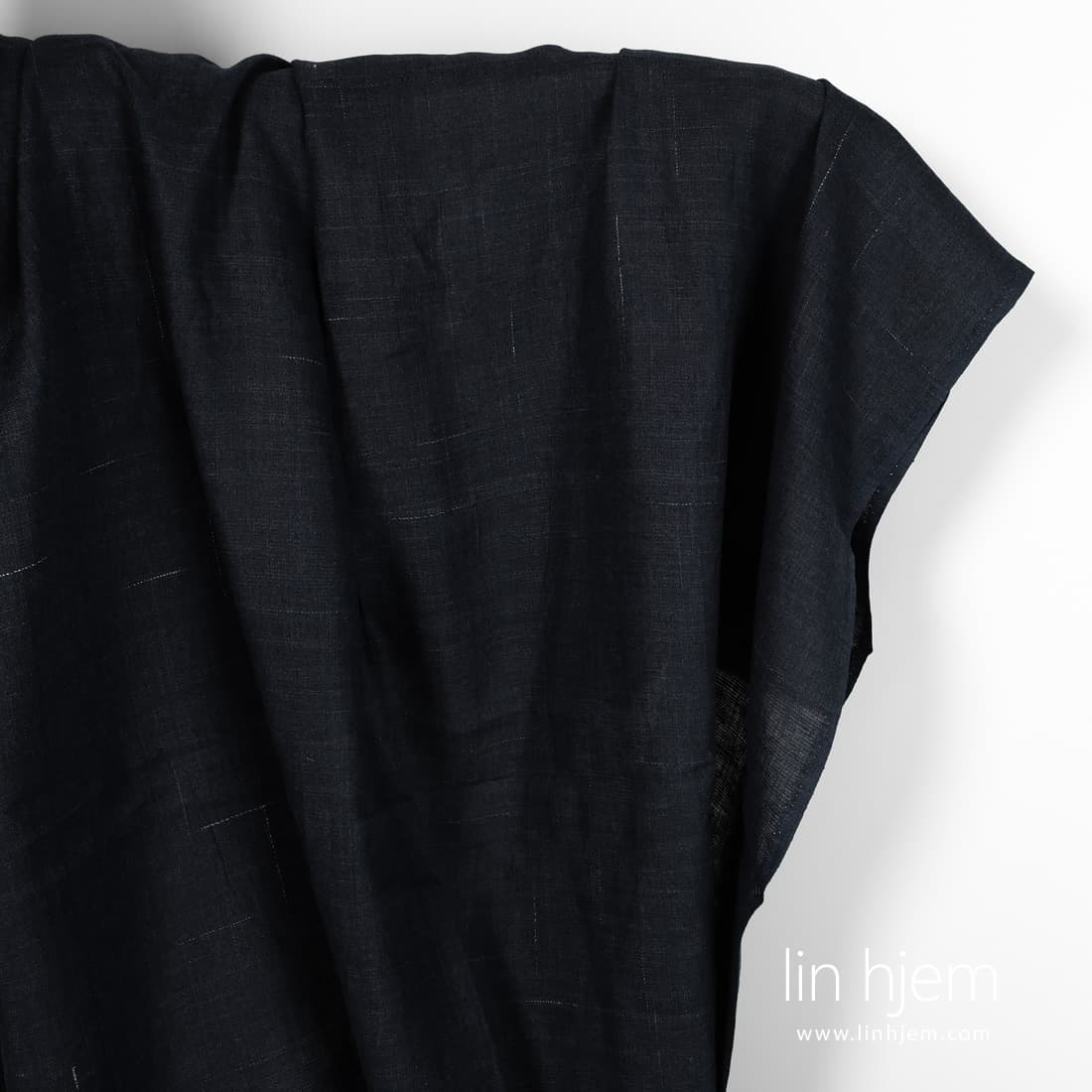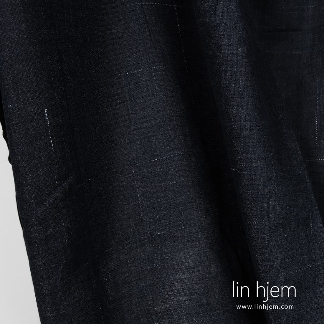 Mørkeblått linstoff i hvite tilfeldige polyester striper som er holdbart, tettvevd, av middels tykkelse. Passer til å sy klær og hjem tekstil produkter (duker, servietter, gardiner, forklær).