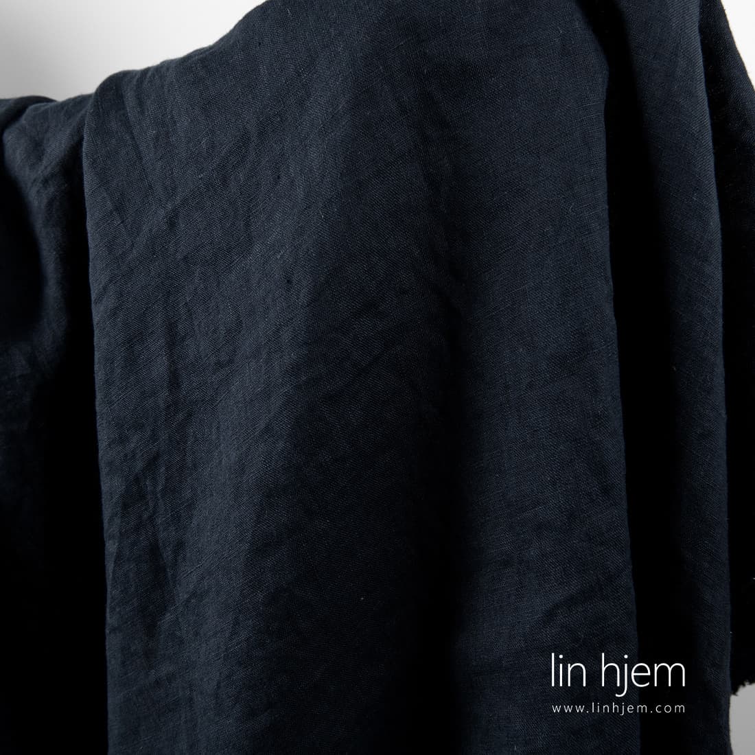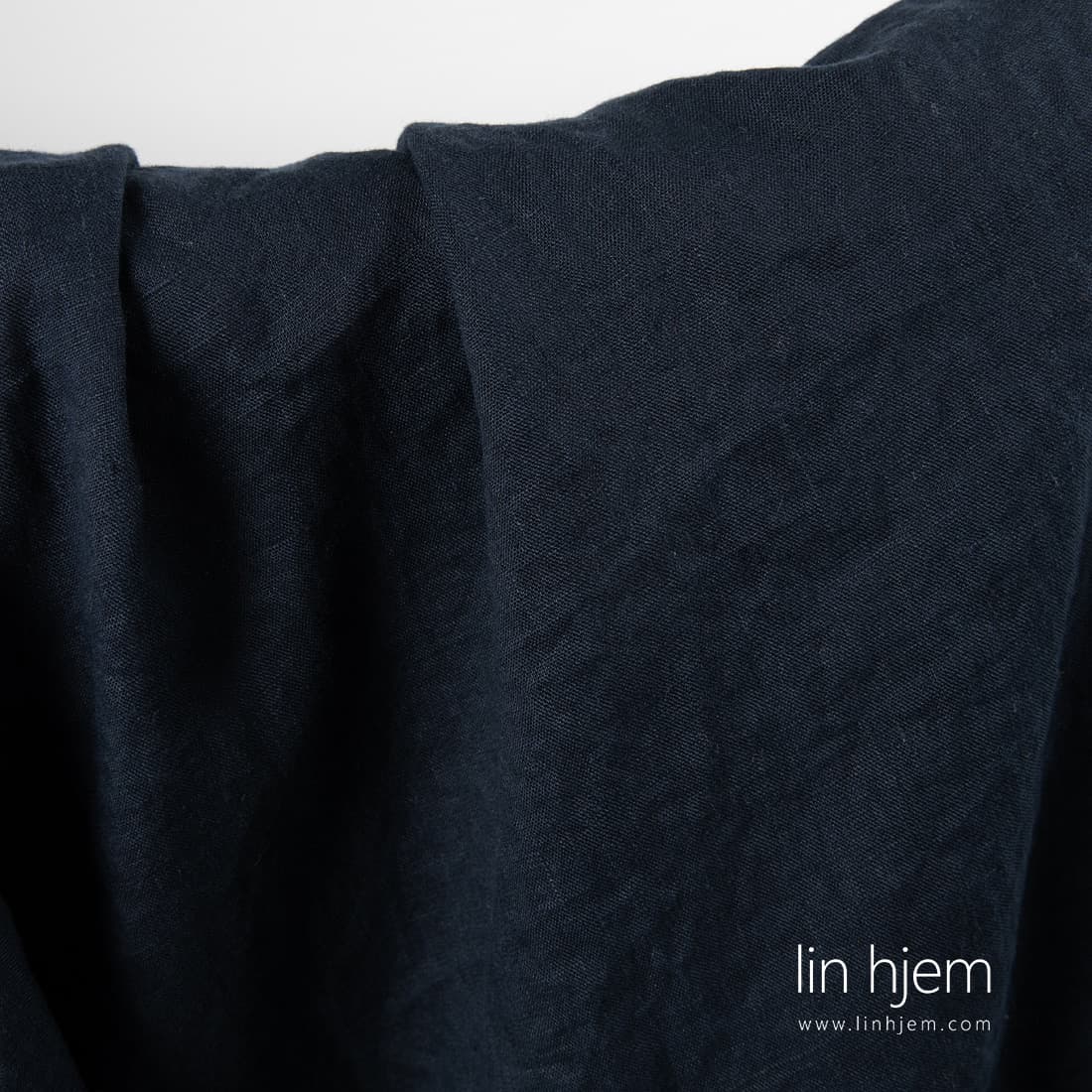 Mørkeblått vasket linstoff. Lett, tynn, litt gjennomsiktig. Spesielt vasket stoff som er mykt, skånsomt, krymper ikke.