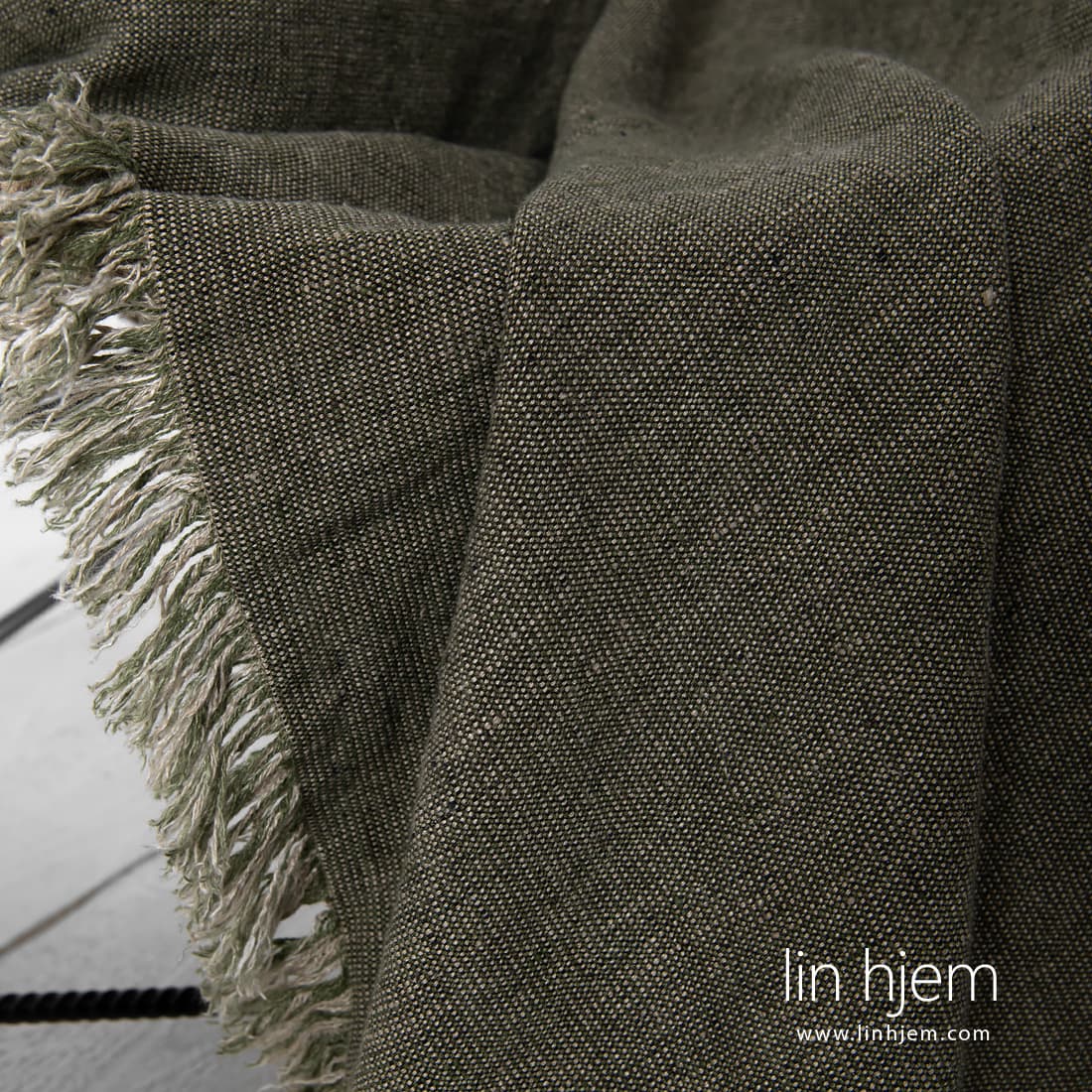 MOSSA grønt pledd. Produktets stoff ble laget av grønne, sand farget, brune og svarte garn. Dette pleddet er ganske tungt men ekstremt mykt og skånsomt. Spesielt vasket med ny teknologi. Kortsidene dekorert med 5cm lange frynser. Anbefaler å kjøpe putetrekk av samme linstoff. Dekorer sitt soverom med dette naturlige pleddet.