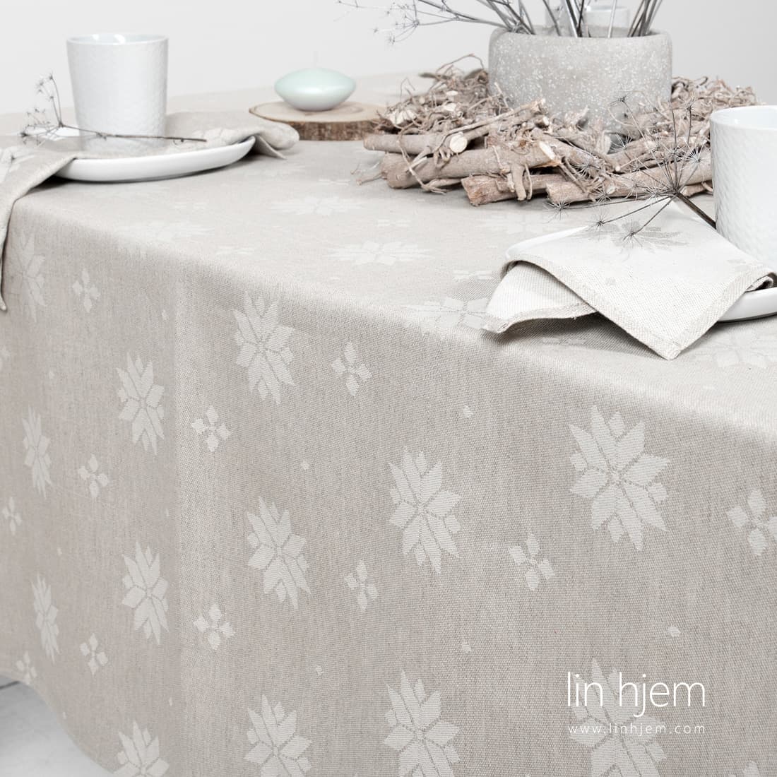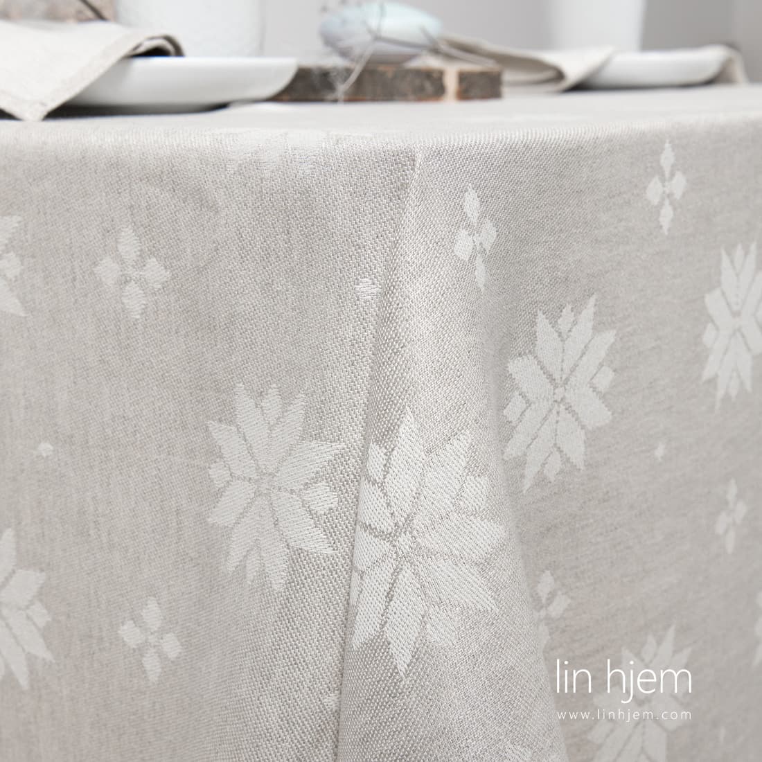 Halvlin lysegrå duk med stjerner. Jacquard stoff ble vevd av hvite bomulls og naturlig grå lingarn. Varm og rolig farge. Sjekk også våre linservietter av samme stoff og mønster.