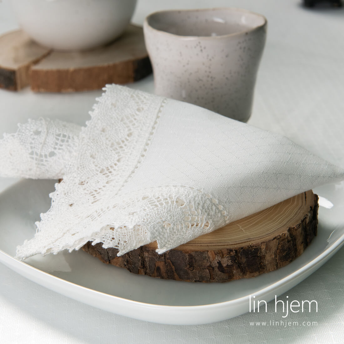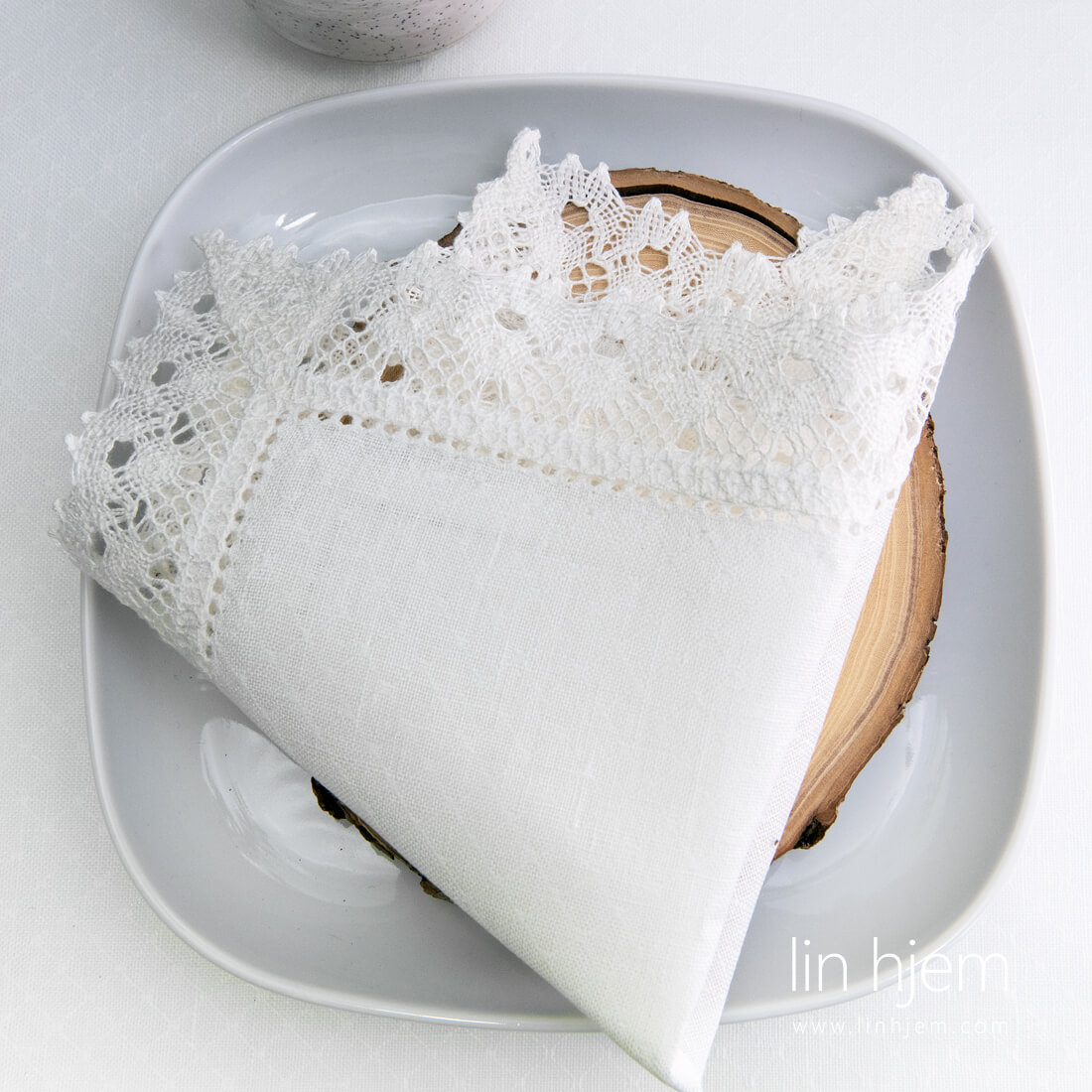 hullmønstret hvit serviett i lin med blonder. 1 linje i hullmønster på alle kanter. Mønstret i små romber. 100% linstoff og subtile blonder gjør denne servietten til en unik borddekorasjon. Hvis du vil ha et komplett sett, har vi også firkantede, runde, ovale duker laget av samme stoff, dekorert med blonder. Det er ikke noe mer subtilt enn ren hvit og luksuriøs blonde i lin. Passer perfekt til de vakreste feiringene med familien.