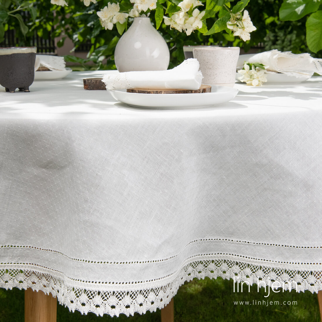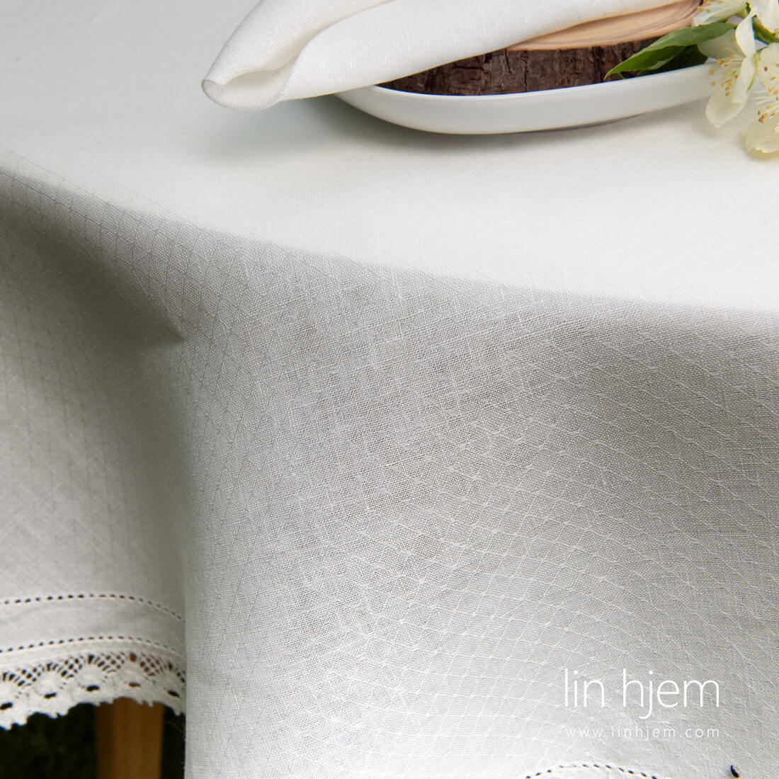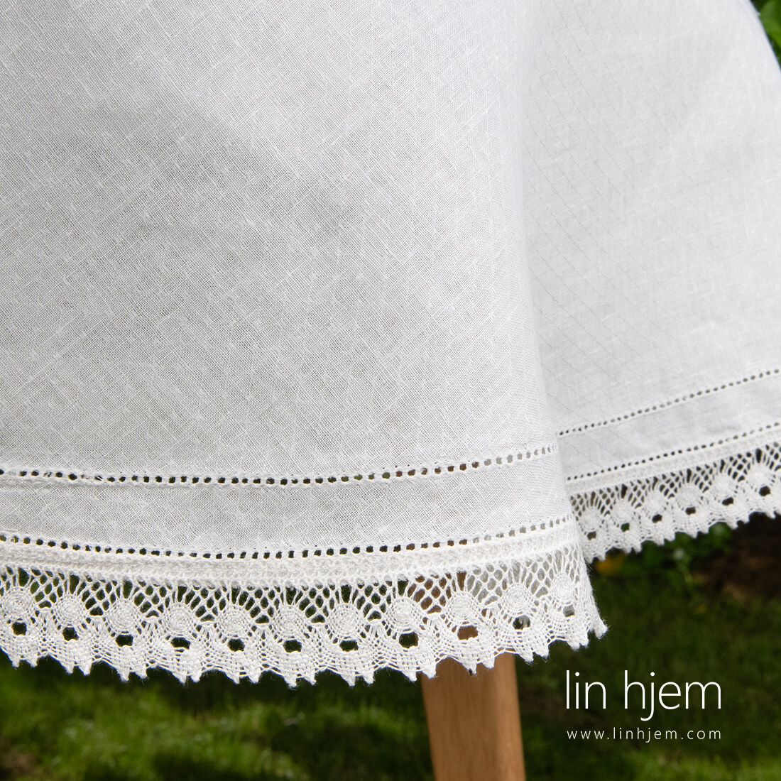Melkehvit rund duk i lin med blonder og to linjer med hullmønster. Produktet er mønstret med små romber. Luksuriøst blonder i lin og delikat stoffmønster som skaper en følelse av luksus, vil dekorere spisebordet ditt til spesielle anledninger. Servietter av samme stoffet passer perfekt til denne duken.