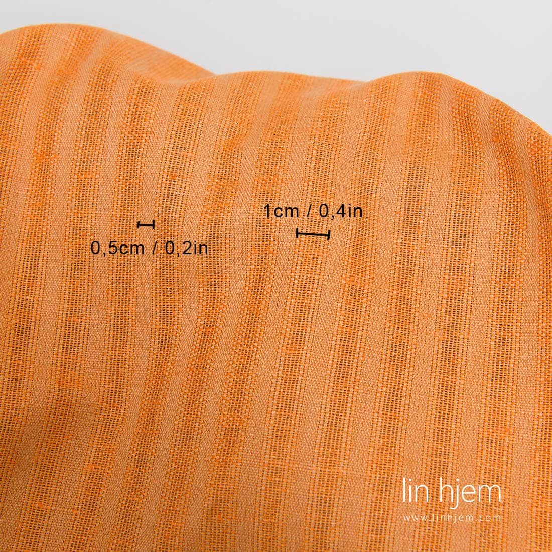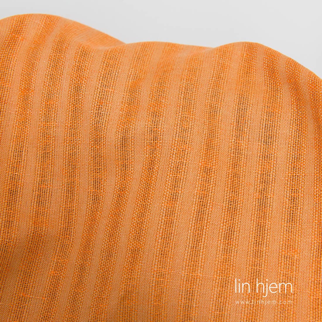 Oransje stripete halvlin stoff. Vertikale striper av lysebrune garn og bredere oransje striper er løstvevde, gjennomsiktige. Stoffet er holdbart, av middels tykkelse.