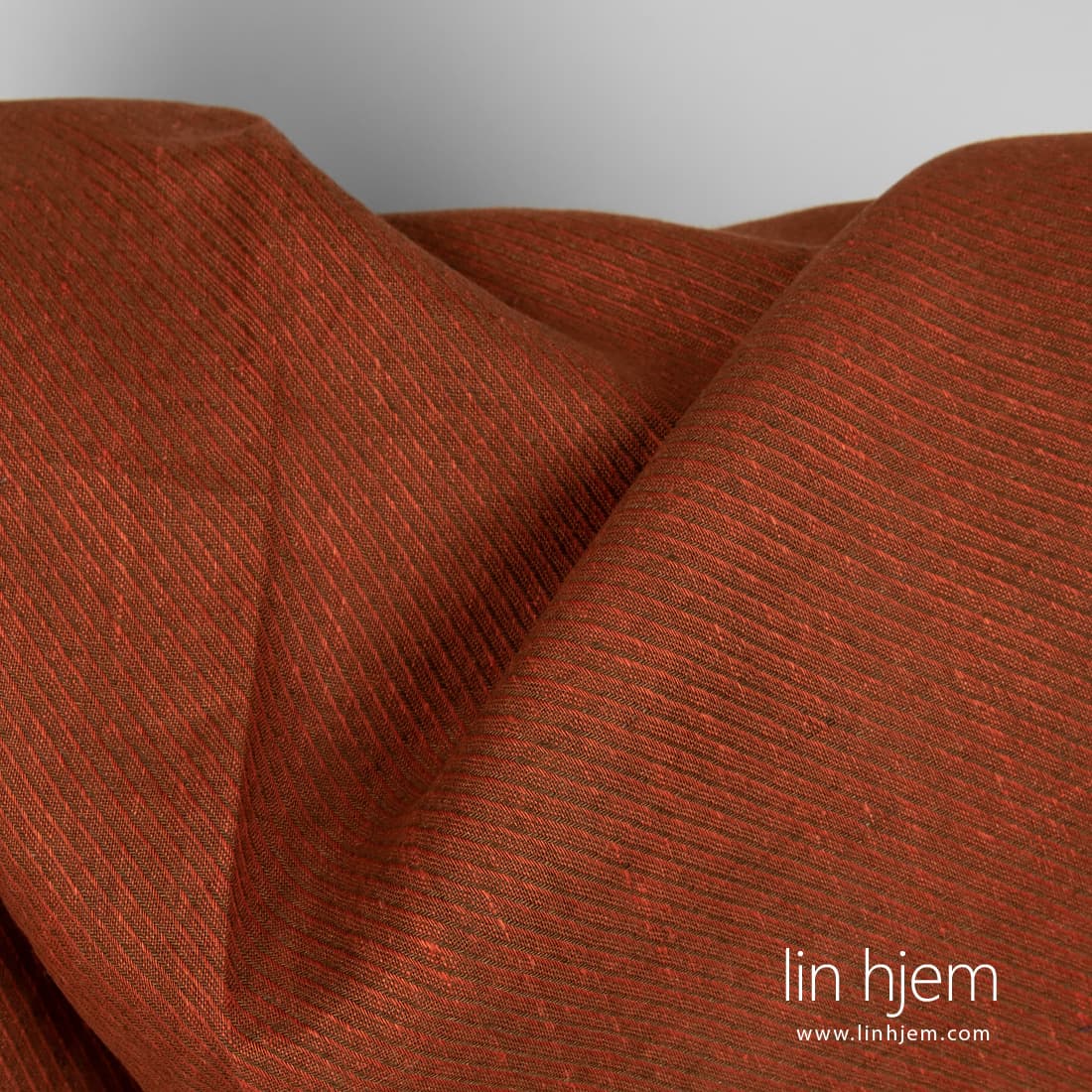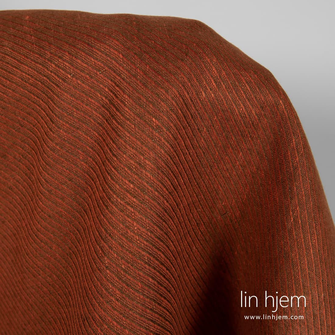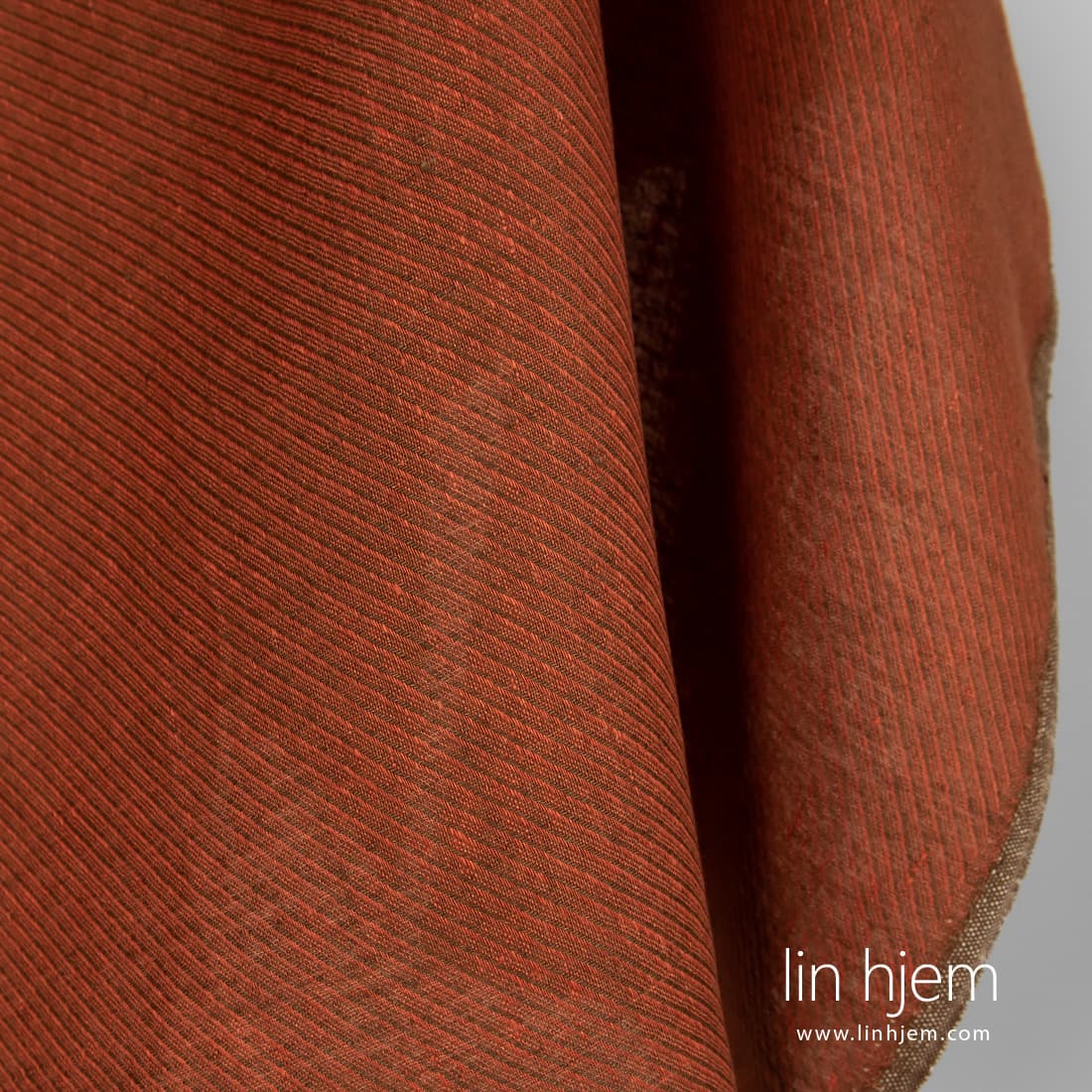 Oransje stripete linstoff vevd diagonalt av oransje og brune garn. Holdbart, tettvevd, middels tykkelse. Dette stoffet passer best til å sy klær og hjem tekstil produkter.
