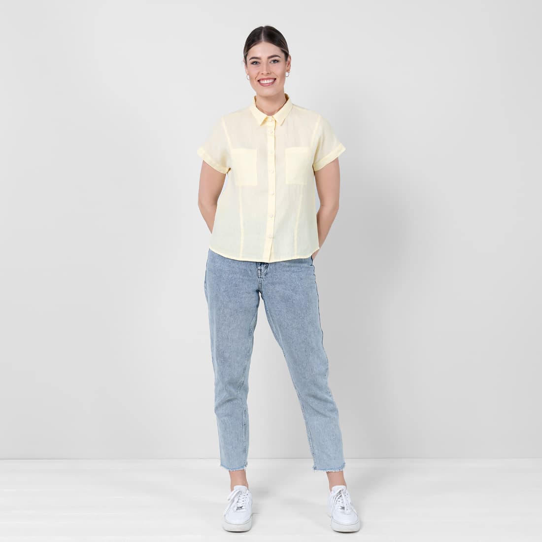 - Detaljer: korte ermer, skjortekrage, lang knappestolpe, brystlommer