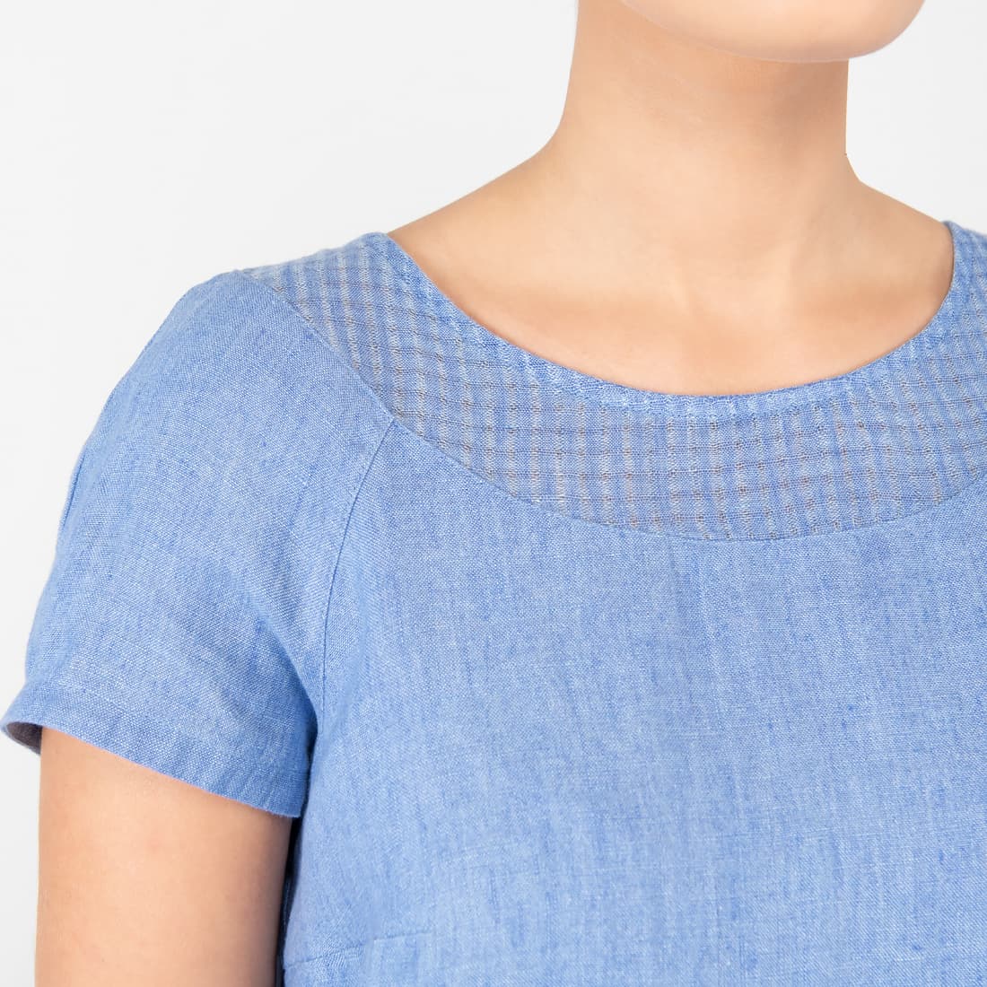 - Detaljer: korte ermer, detalj av et tynnere stoff rundt den runde halsen, samme tynnere stoff nederst på kjolen, små slisser foran