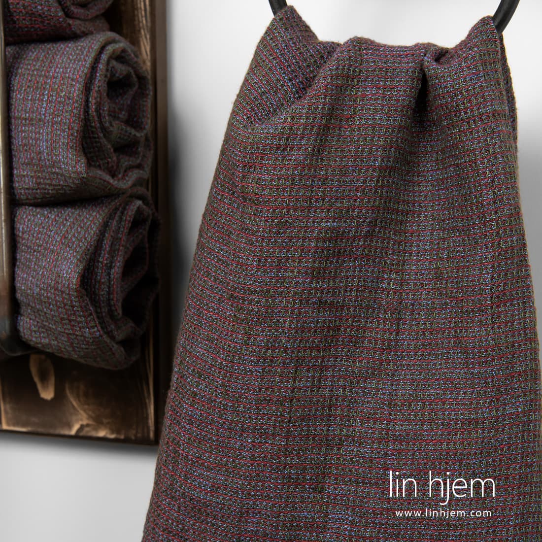 PURO fargerikt håndkle. "Vaffel" linstoff som ble vevd av mørkegrønne, blå og brun-røde garn. Produktet ble spesielt vasket for å gjøre håndkleet veldig mykt, skånsomt. Finnes i 3 størrelser.