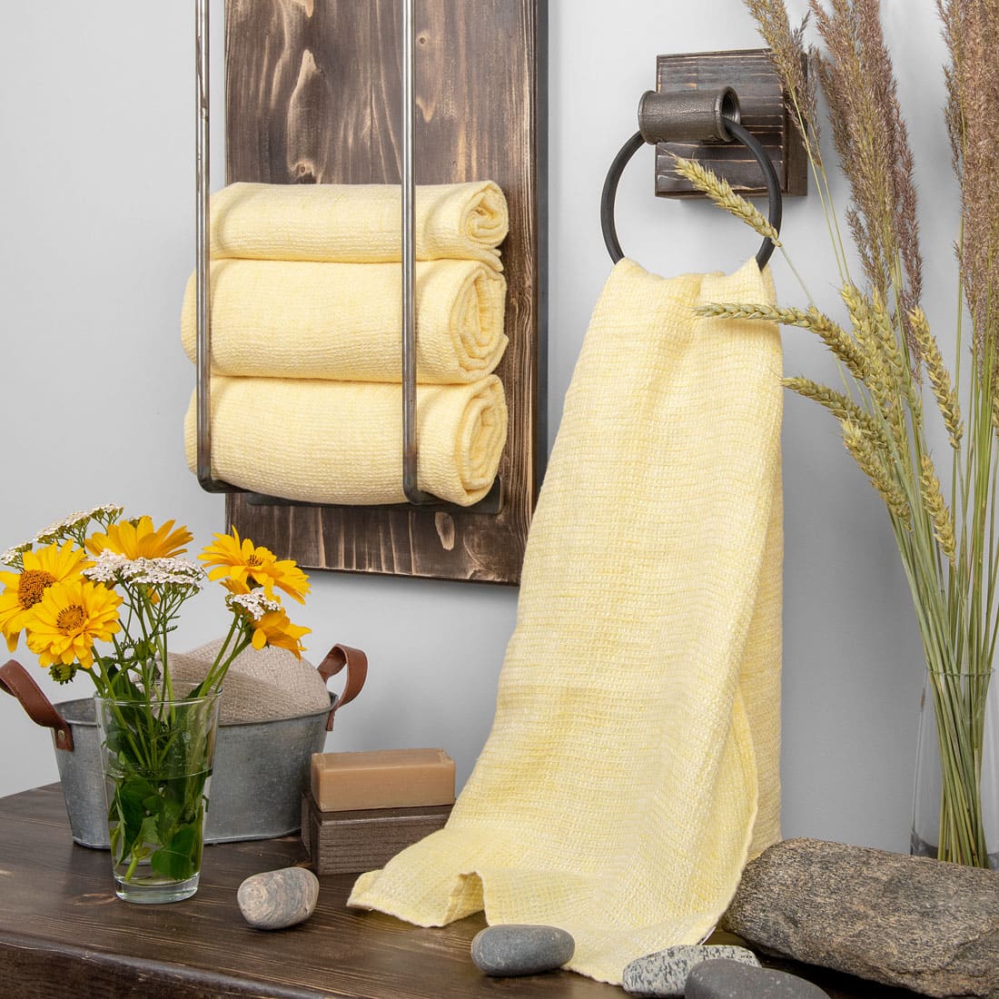 - Farge: vevd av lysegult og hvitt garn