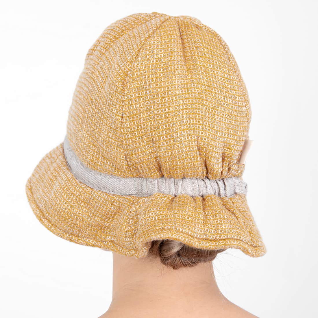- Farge: vevd sennepsgult og naturlig (ufarget, brungrått) garn, melange