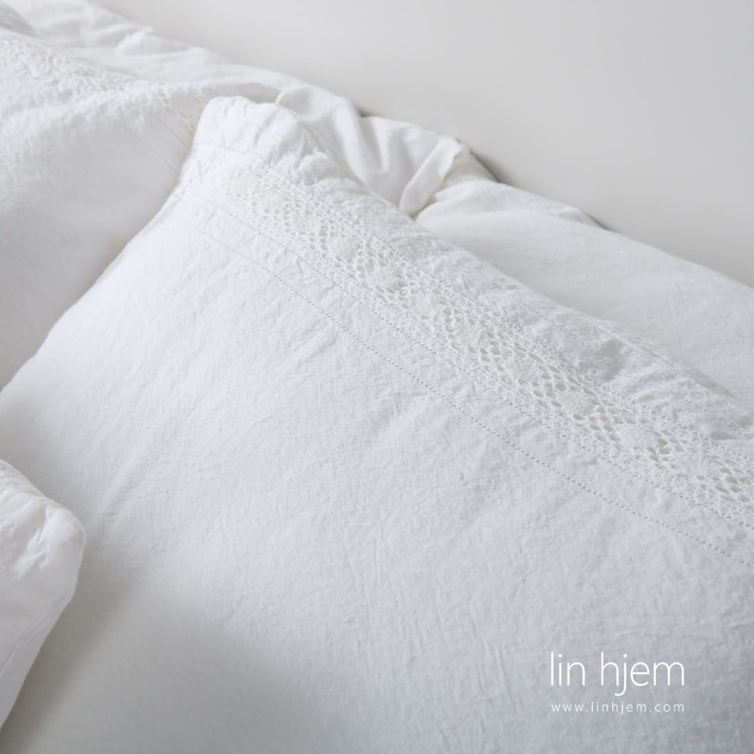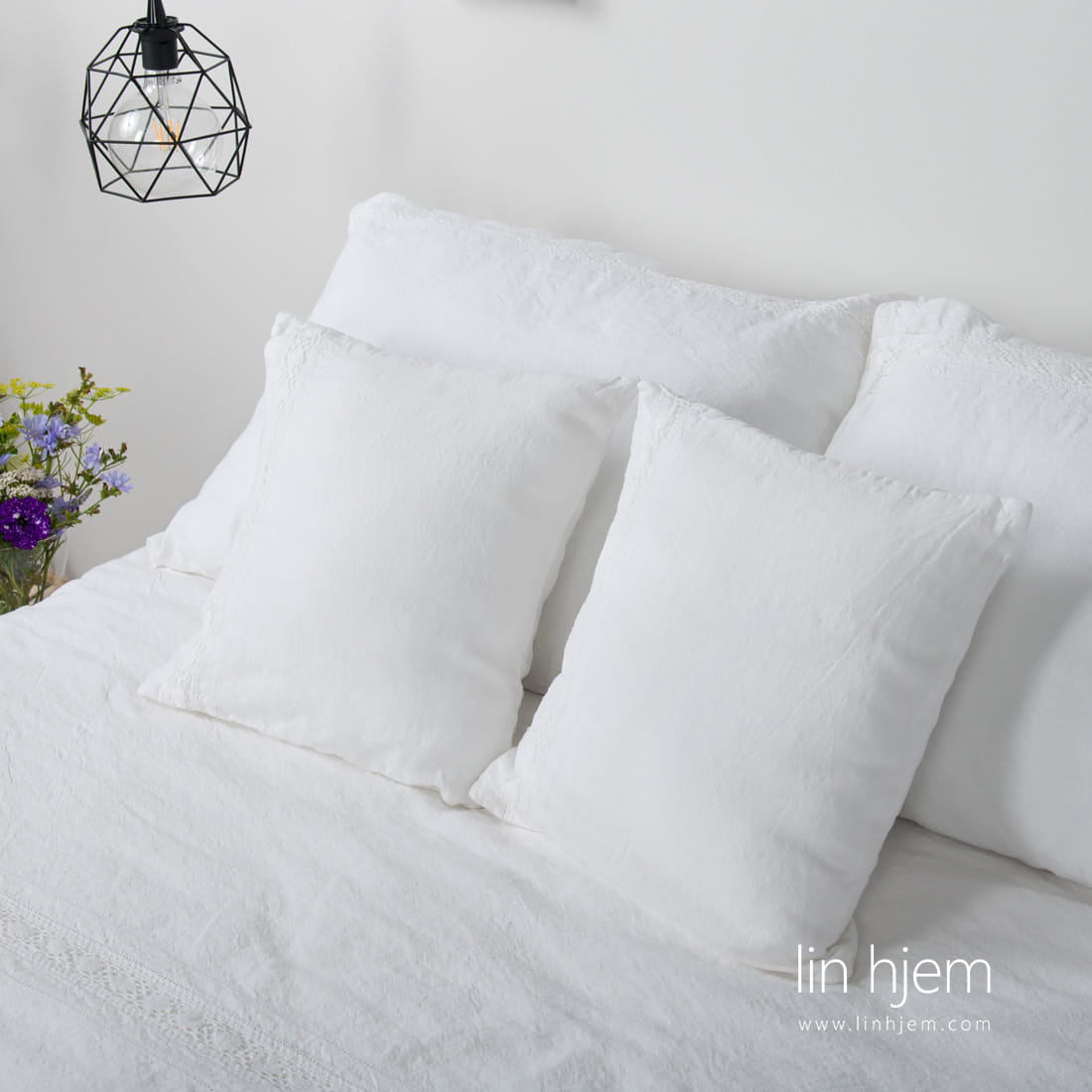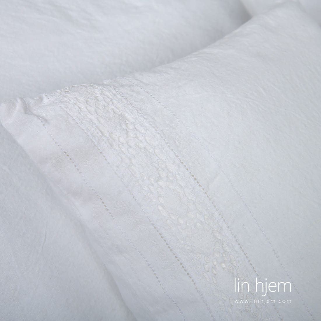- Kritthvitt putetrekk med blonder laget med klaff lukking.