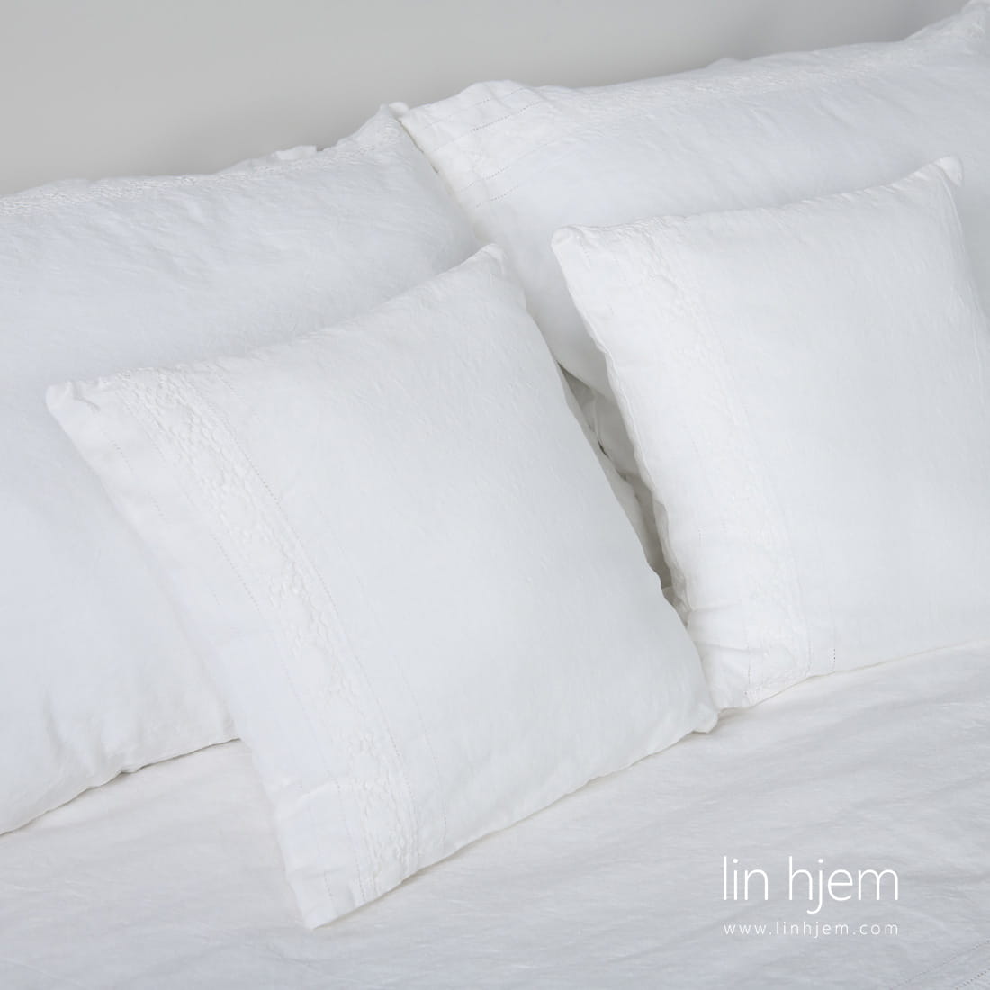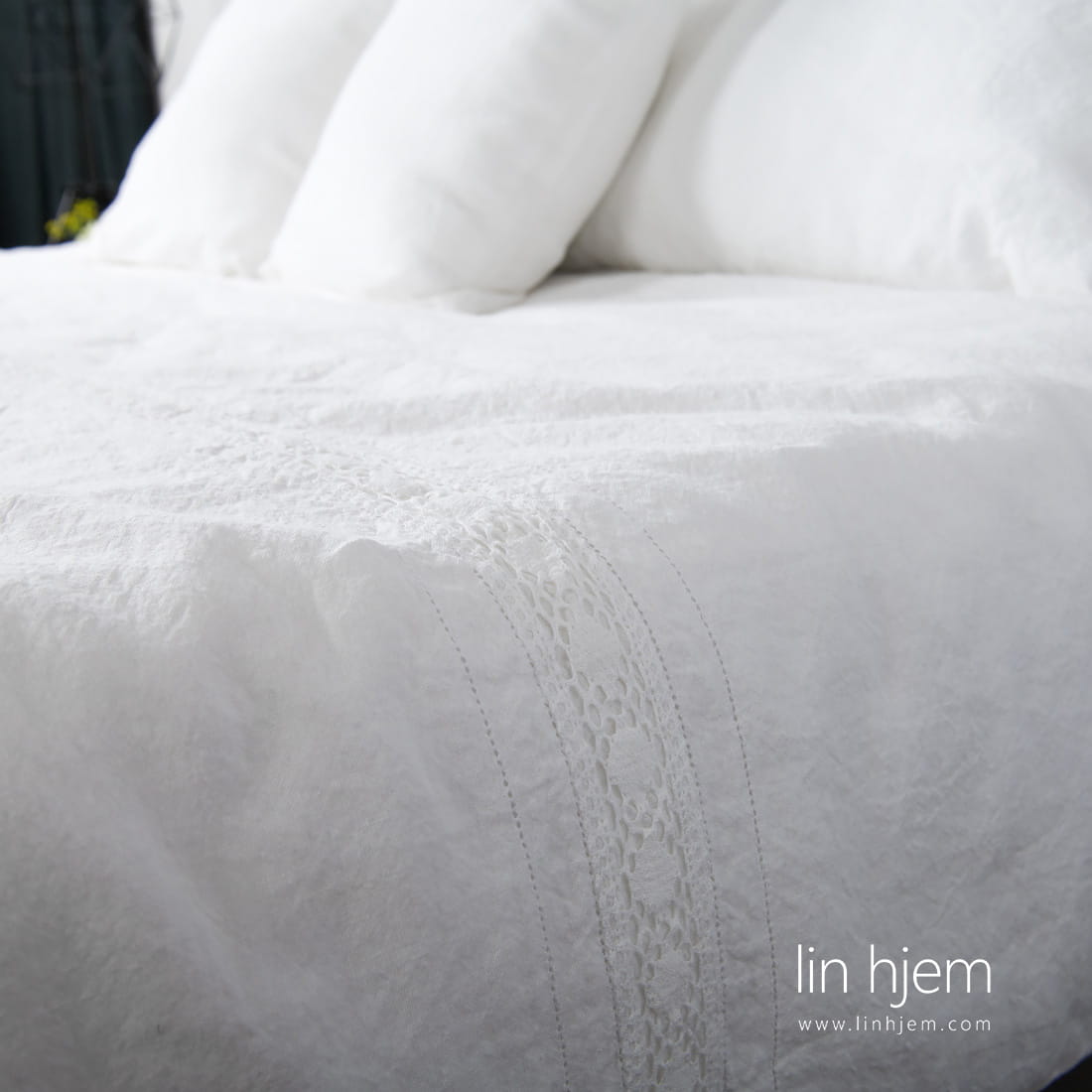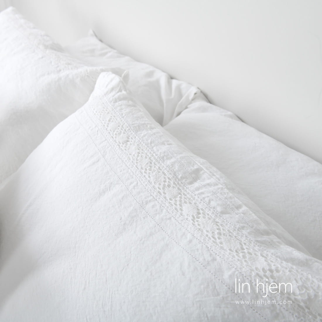 - Kritthvitt putetrekk med blonder laget med klaff lukking.