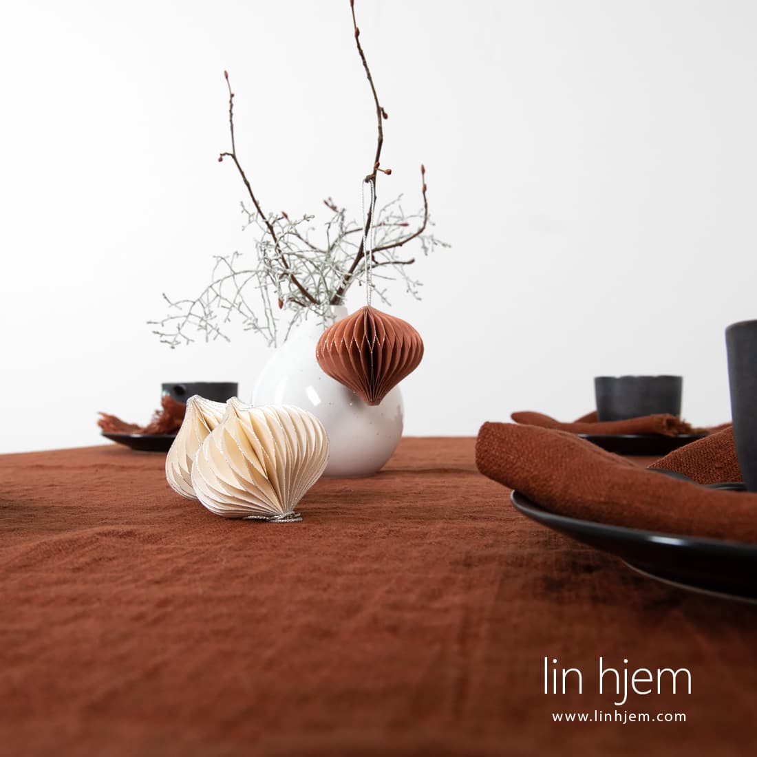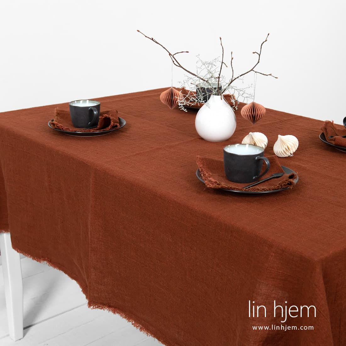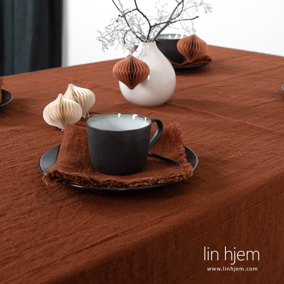 ROY brun duk. Dette produktet ble laget av 100% melange linstoff som er vevd av mørkebrune og rød-brune garn. For å gjøre denne duken myk, skånsom og behagelig mot huden har vi vasket den med ny teknologi. Trenger ikke å stryke. Sidene er dekorert med 1,5cm lange frynser. Pynt spisebordet ditt med denne duken i subtil farge!