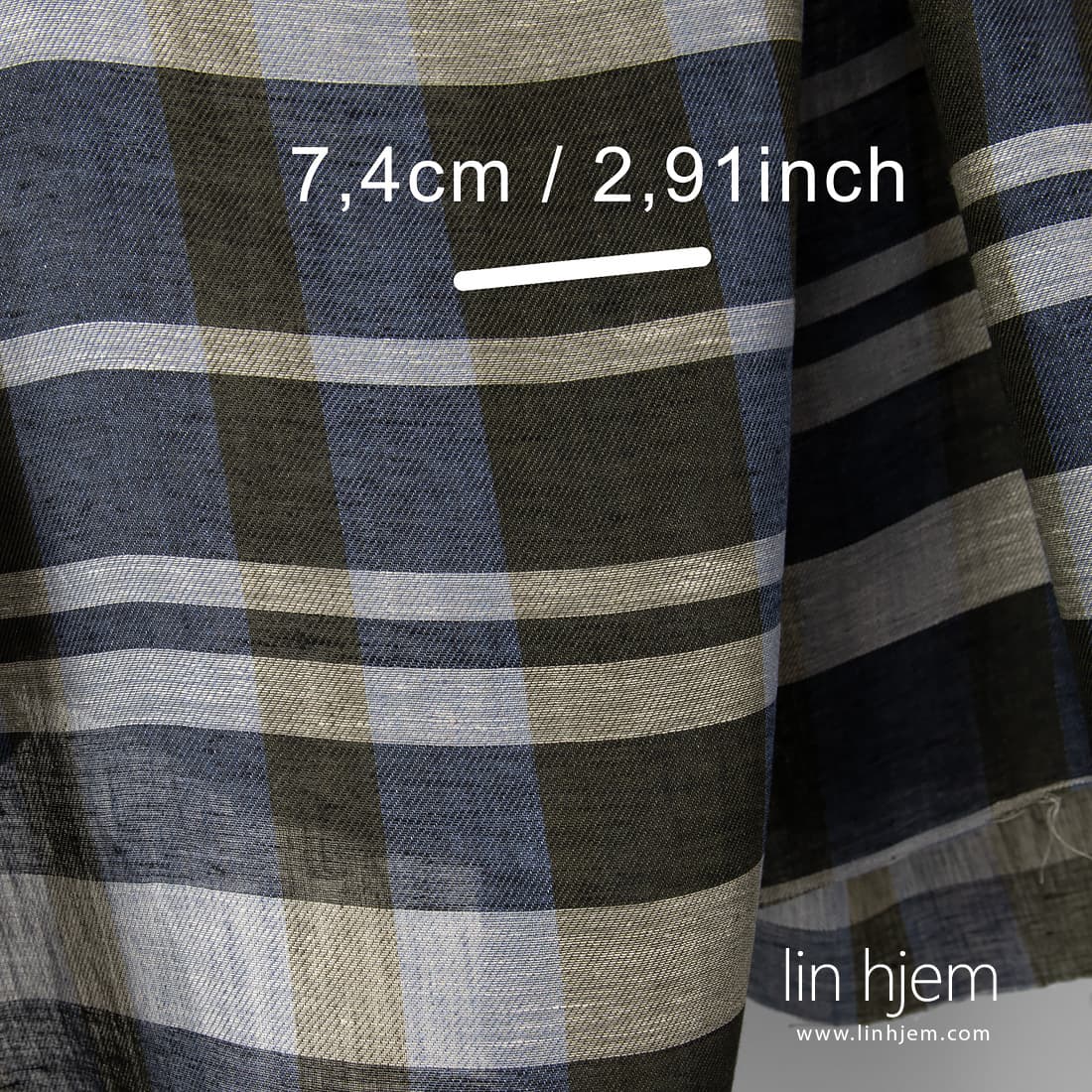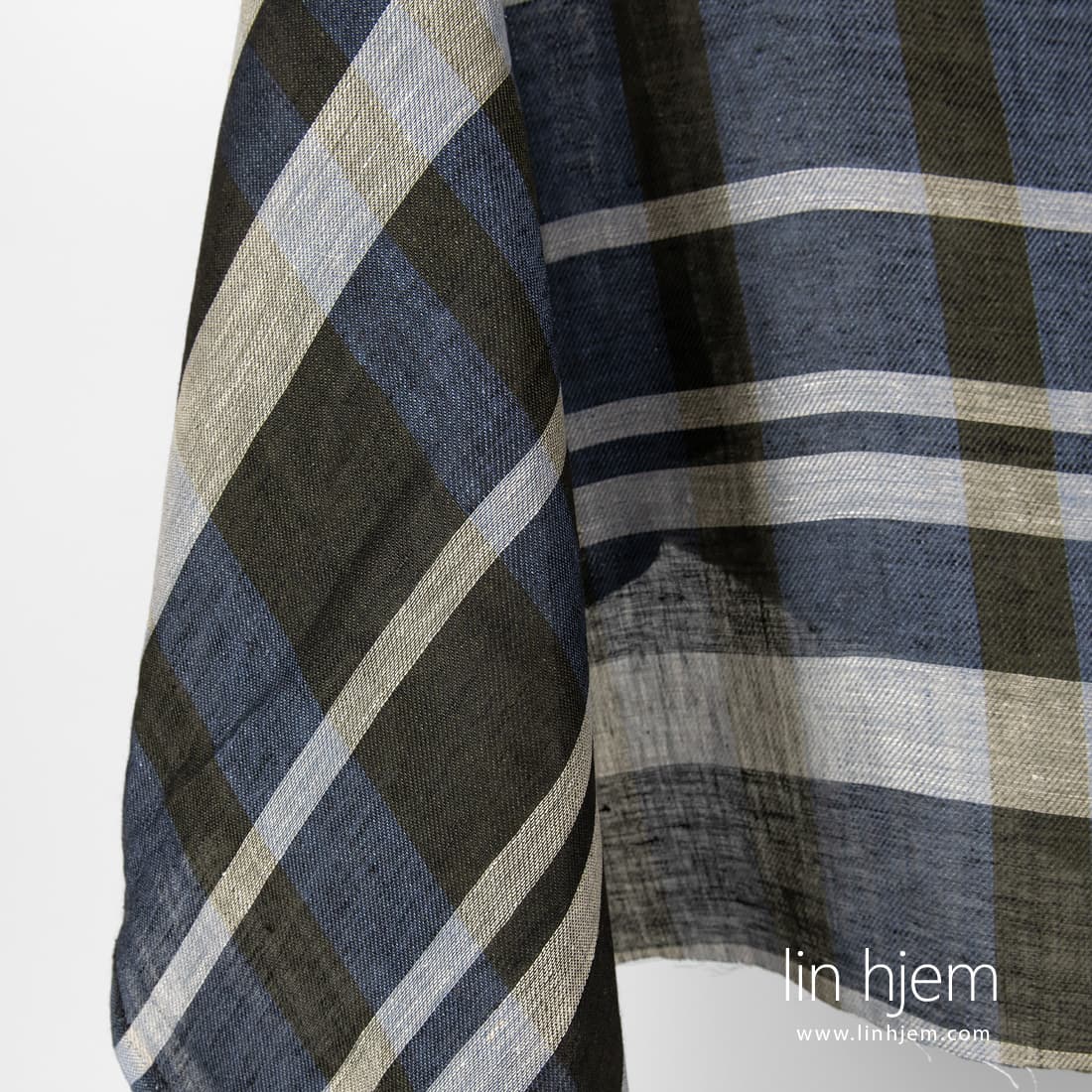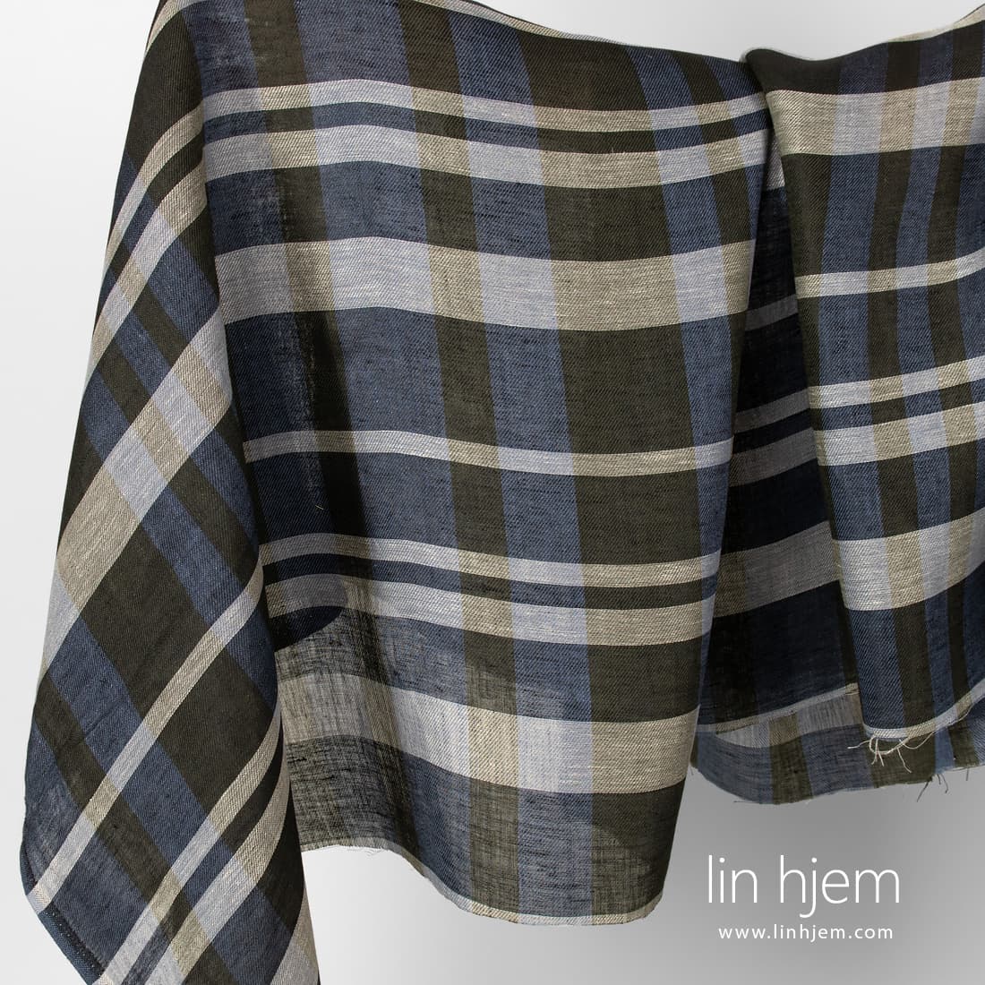 Blått-grønt linstoff i ruter, vevd av blå-grå, brun-grønne, svarte og naturlig (ufarget) lingarn. Lett, holdbart, litt gjennomsiktig stoff.