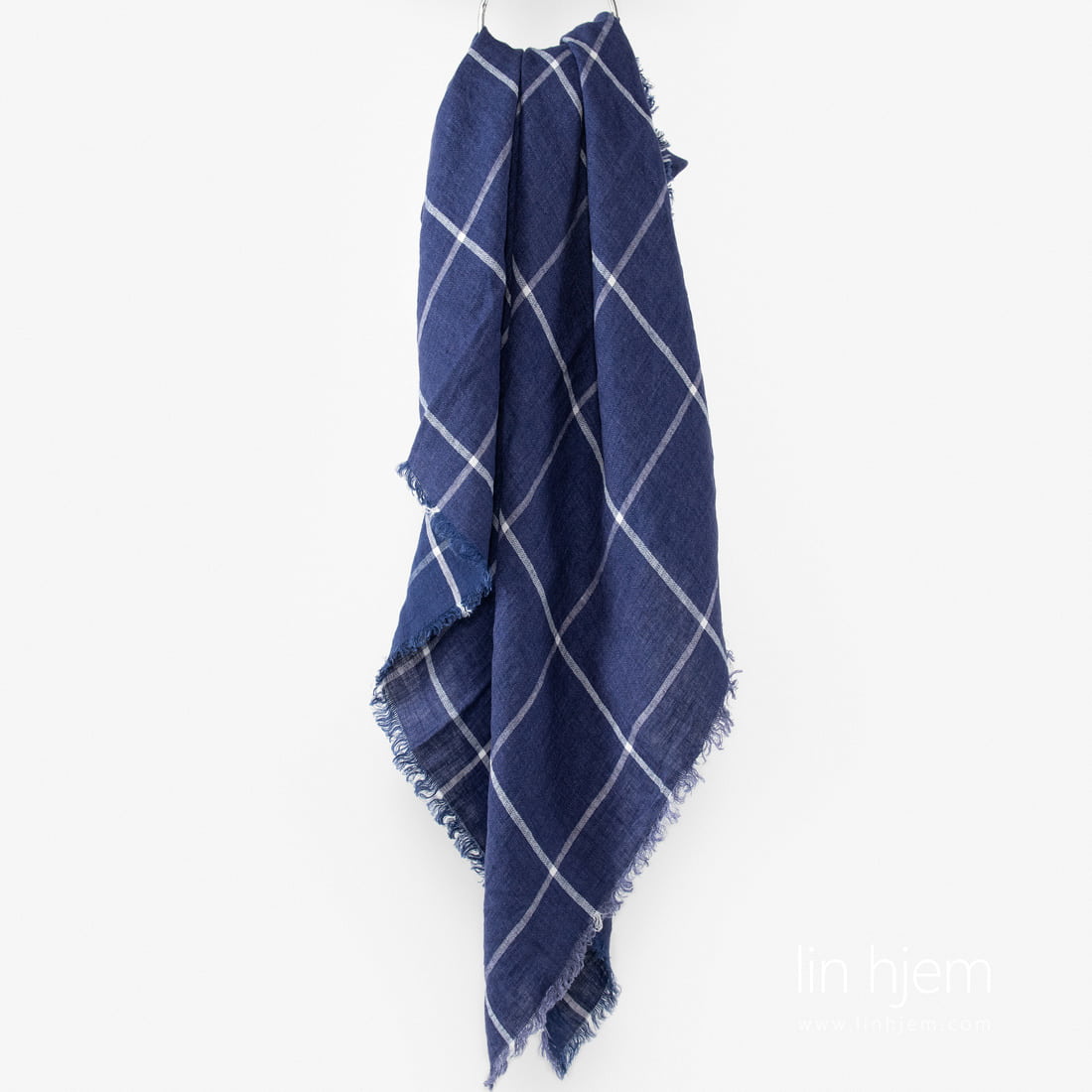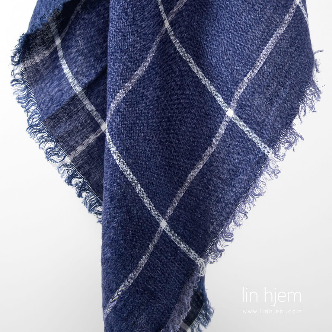 Rutete linskjerf i blå. Stoffet ble vevd fra mørkeblå garn og dekorert med tynne melkehvite striper. Størrelse av en rute (11cm x 12cm). Stoffet er spesielt vasket med ny teknologi som gjør dette produktet veldig mykt, skånsomt og behagelig mot huden. Dekorert med 2cm lange frynser.