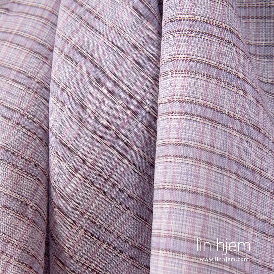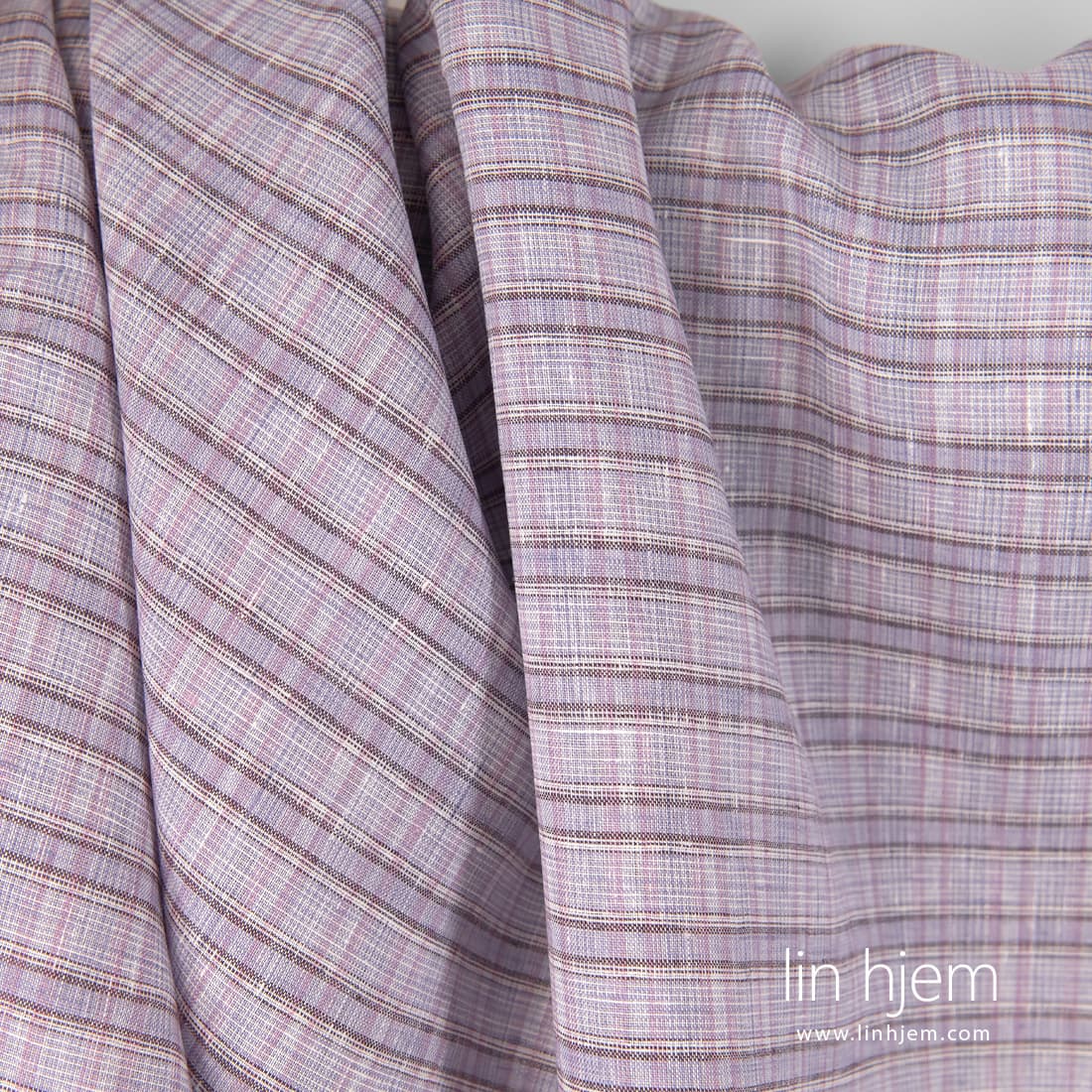 Rutete linstoff i lilla, melkehvite ruter. Lett, holdbart, tettvevd stoff som passer til å sy klær og hjem tekstil produkter.