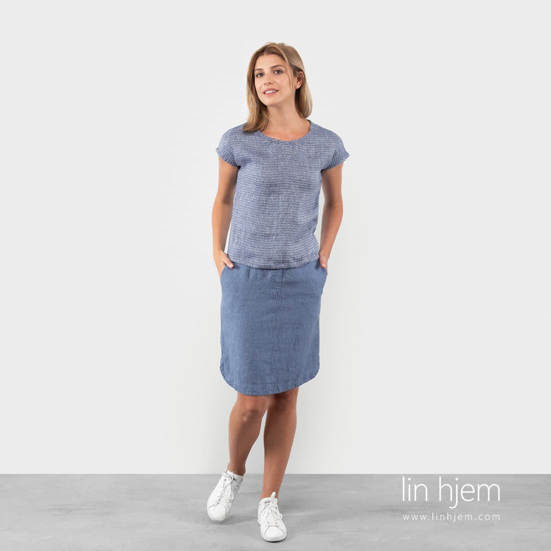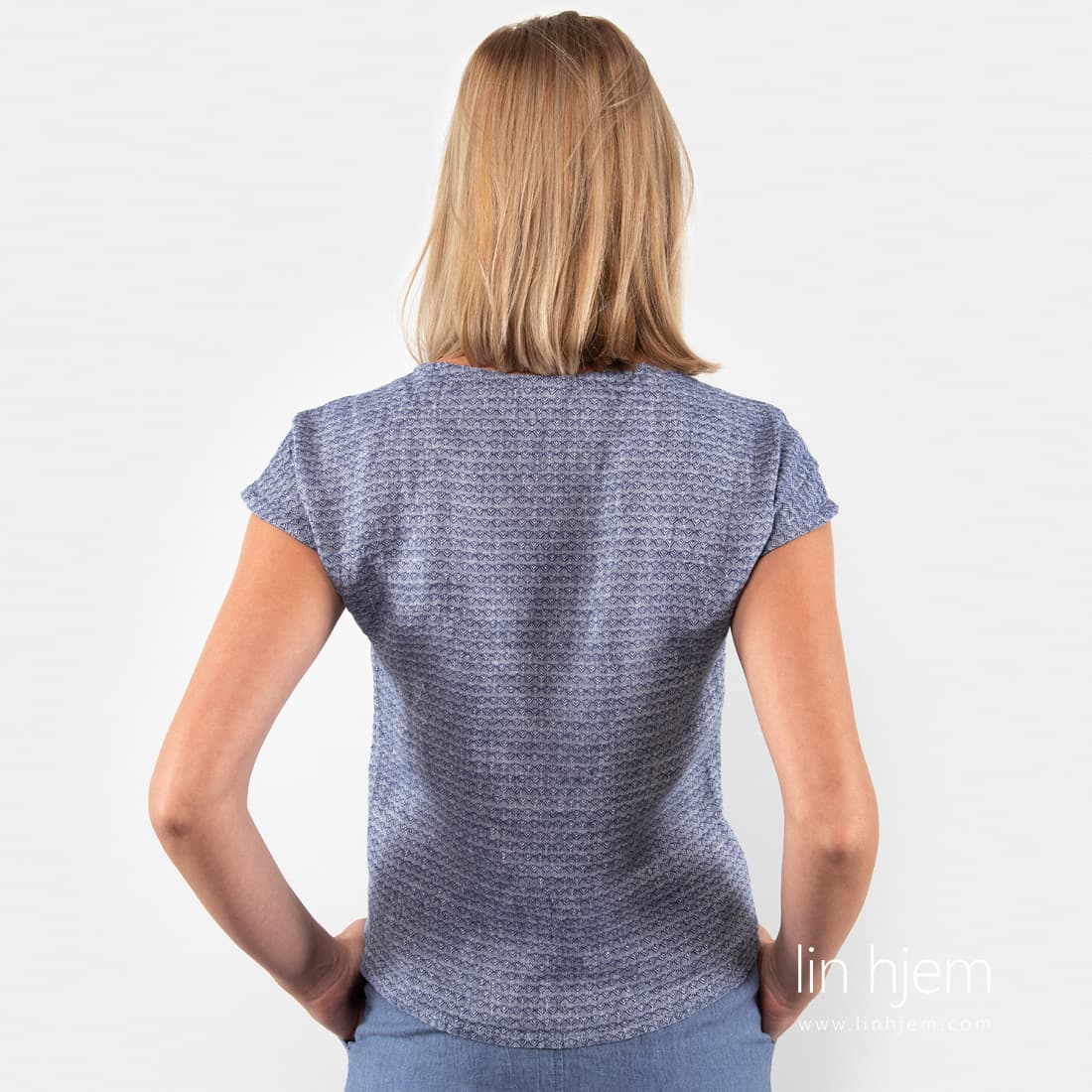 Blå bluse av lin. Produktets geometrisk mønster ble vevd av mørkeblå og hvite garn. Denne blusen er veldig behagelig å ha på. Nydelig farge og høy kvalitet 100% linstoff som absorberer fuktighet veldig godt og tørker fort.