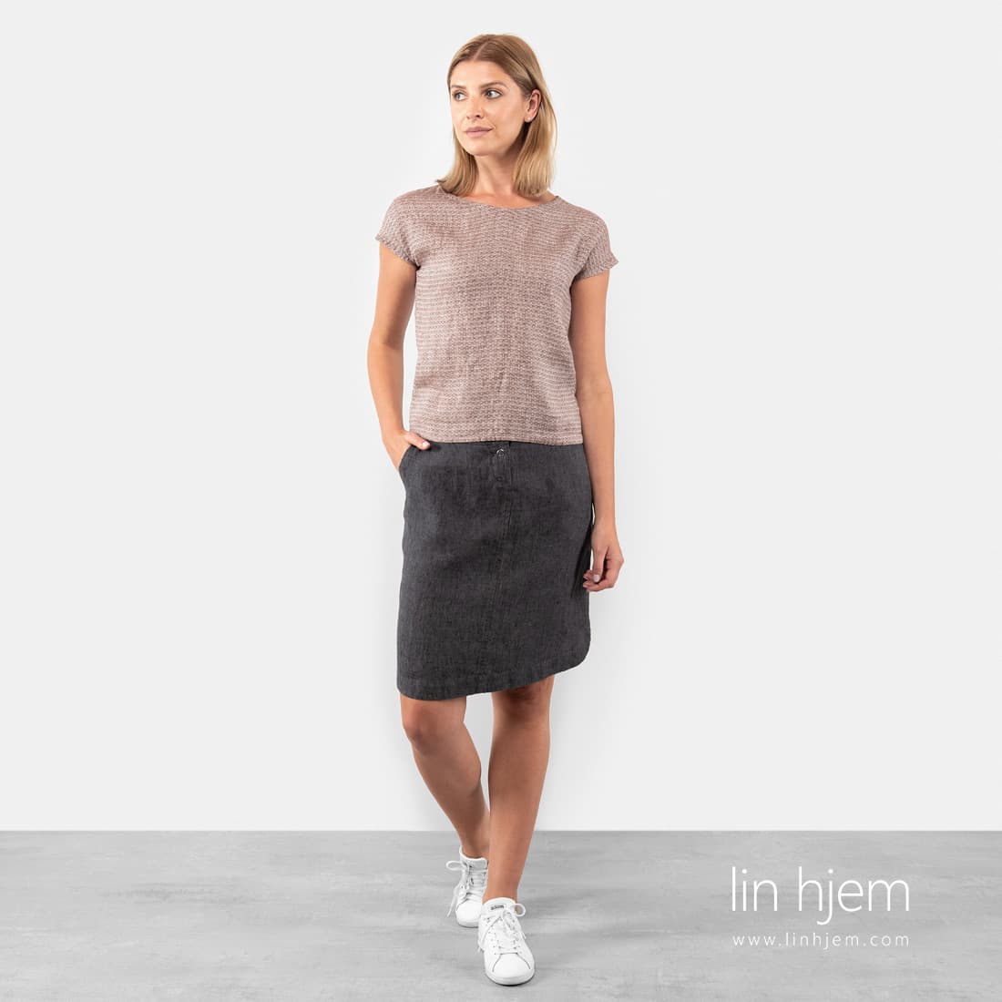 Brun mønstret bluse av lin. Stoffet ble vevd av brune og hvite lingarn. Geometrisk mønster. Subtil og naturlig bluse av høy kvalitet.