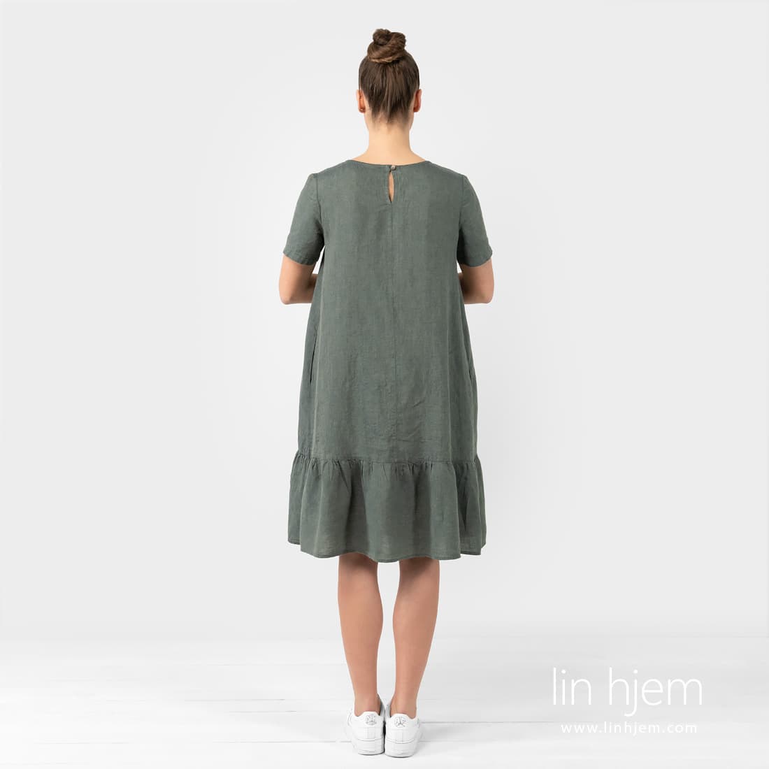 - Detaljer: korte ermer, lommer, rynket under brystet og på bunnen, med en knapp på baksiden