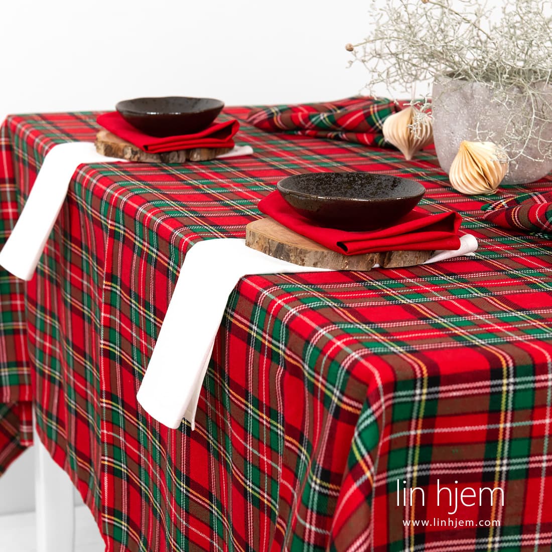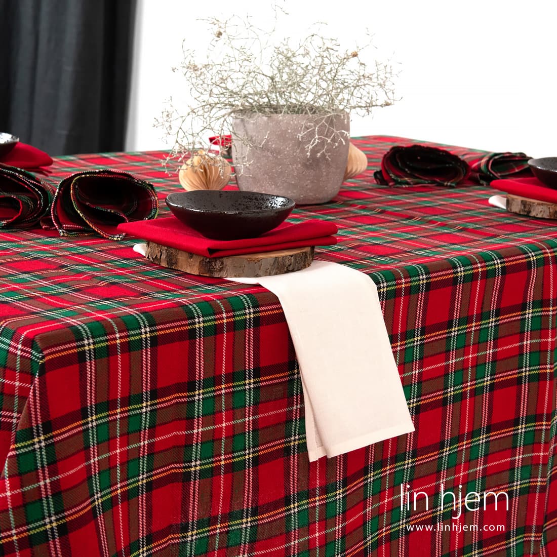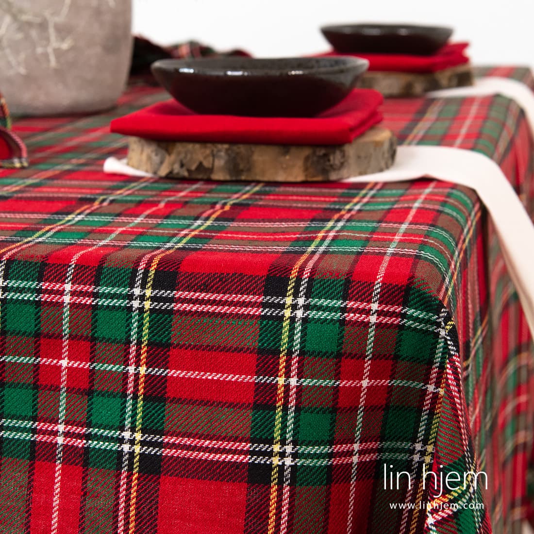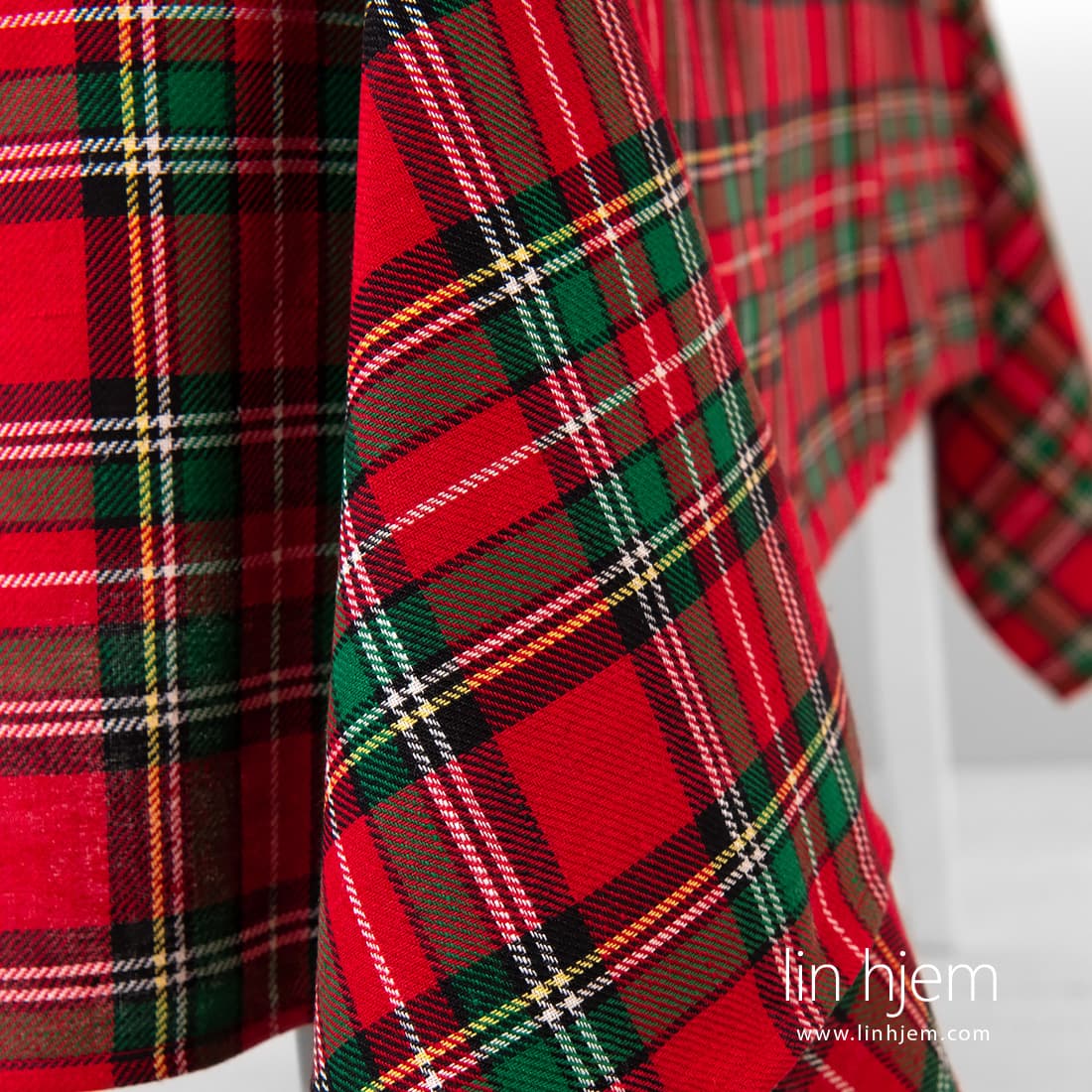 SCARLET rutete duk. Lin-bomulls stoff er vevd i diagonale striper i røde og grønne ruter, dekorert med tynne melkehvite, gule og svarte linjer. Nydelig duk i jul farger! Kombiner denne duken med servietter av samme stoff eller med røde eller melkehvite servietter.