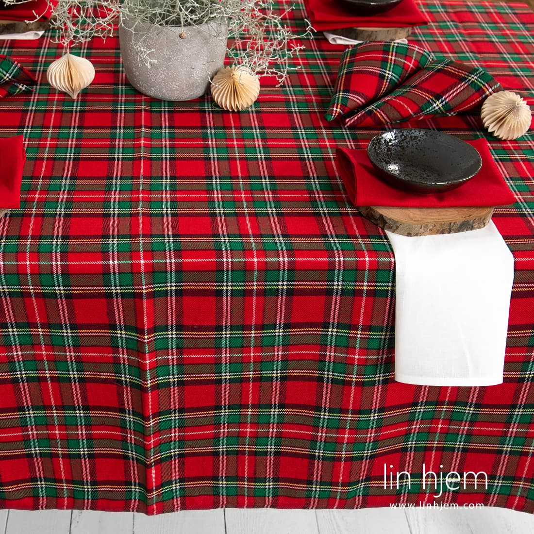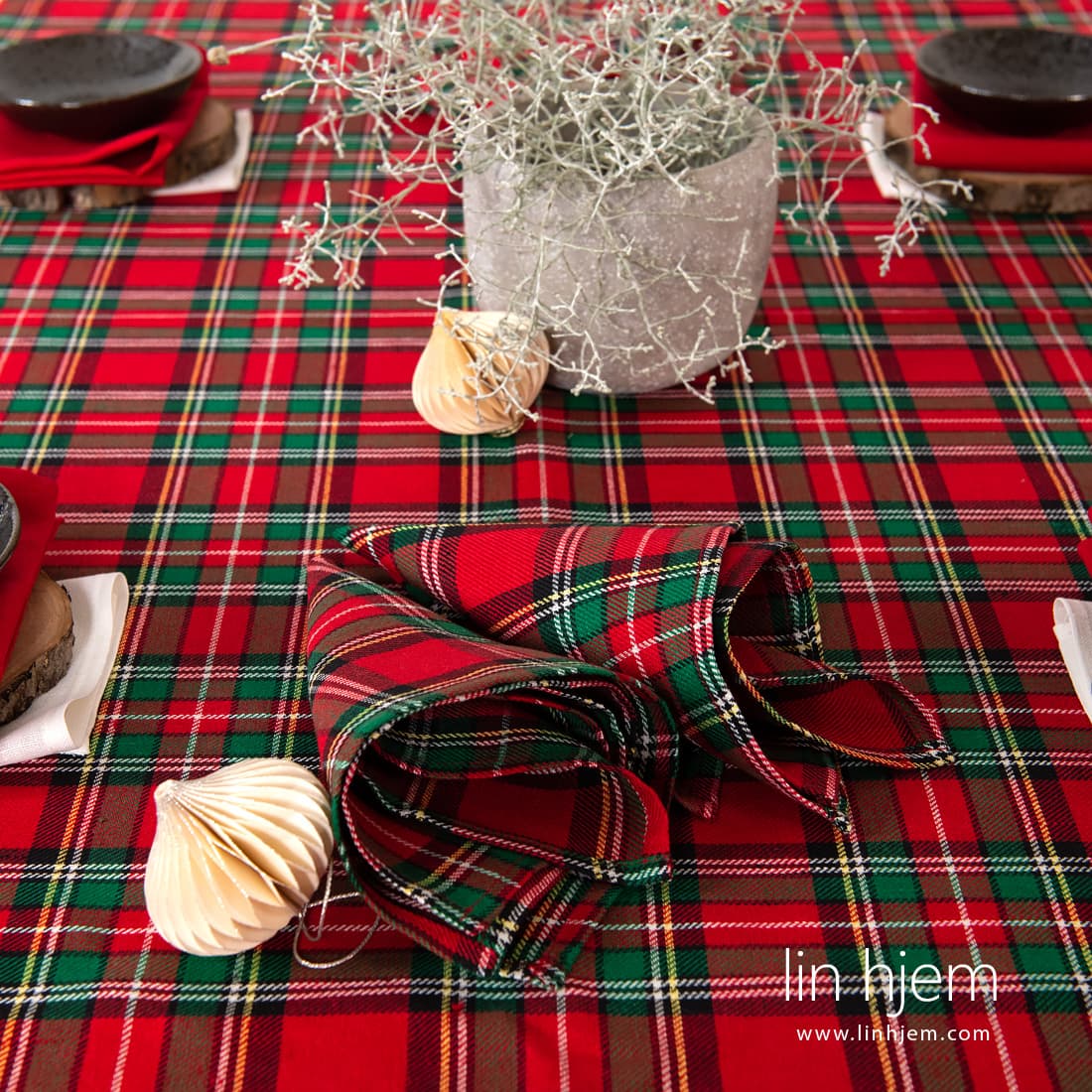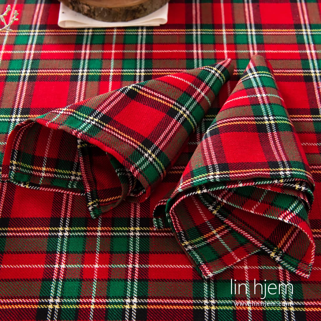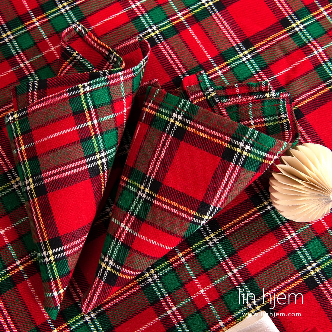 SCARLET rutete serviett. Produktets stoff vevd i ruter og diagonale striper av røde, grønne lin-bomulls garn, dekorert med tynne gule, melkehvite og svarte striper. Pynt festbordet med en leken kombinasjon av julefarger! Til disse serviettene tilbyr vi å kjøpe en duk eller bordløper laget av samme stoff.