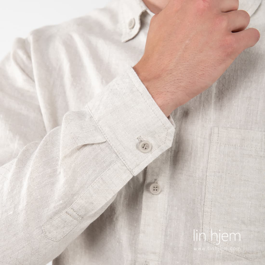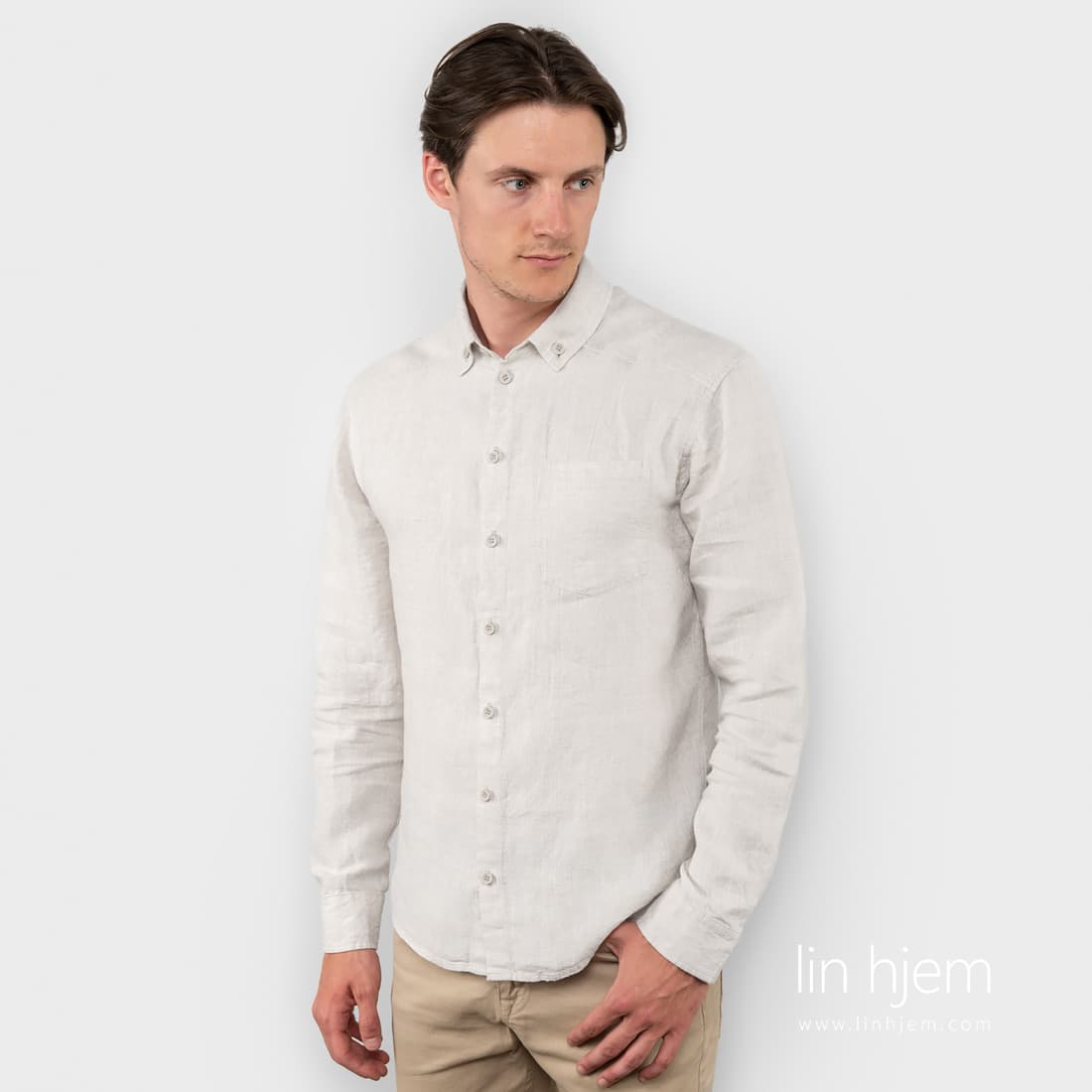 Grå mønstret linskjorte til herre vevd av hvite og naturlig(ufarget) lingarn. Lange ermer og vakkert mønster passer perfekt til spesielle anledninger. Kombiner med bukser av klassisk design.