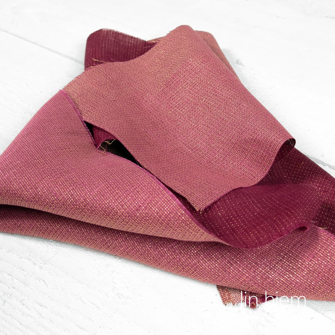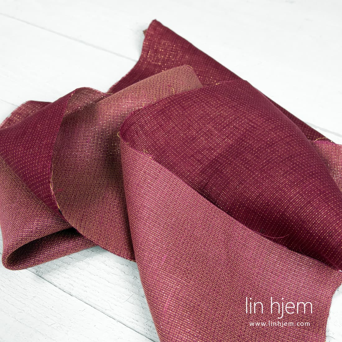 Skinnende mørkerødt linstoff. Tosidig, 2-lag linstoff som ble vevd av 2 nyanser av mørkerøde lingarn og gull farget skinnende polyester garn. Den ene siden er mørkere enn den andre. Holdbart, tettvevd, middels tykkelse. Sy festlig klær, duker, servietter, dekorative putetrekk. Begge sidene kan brukes.