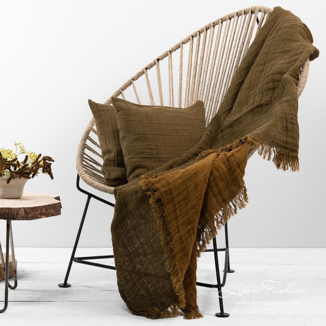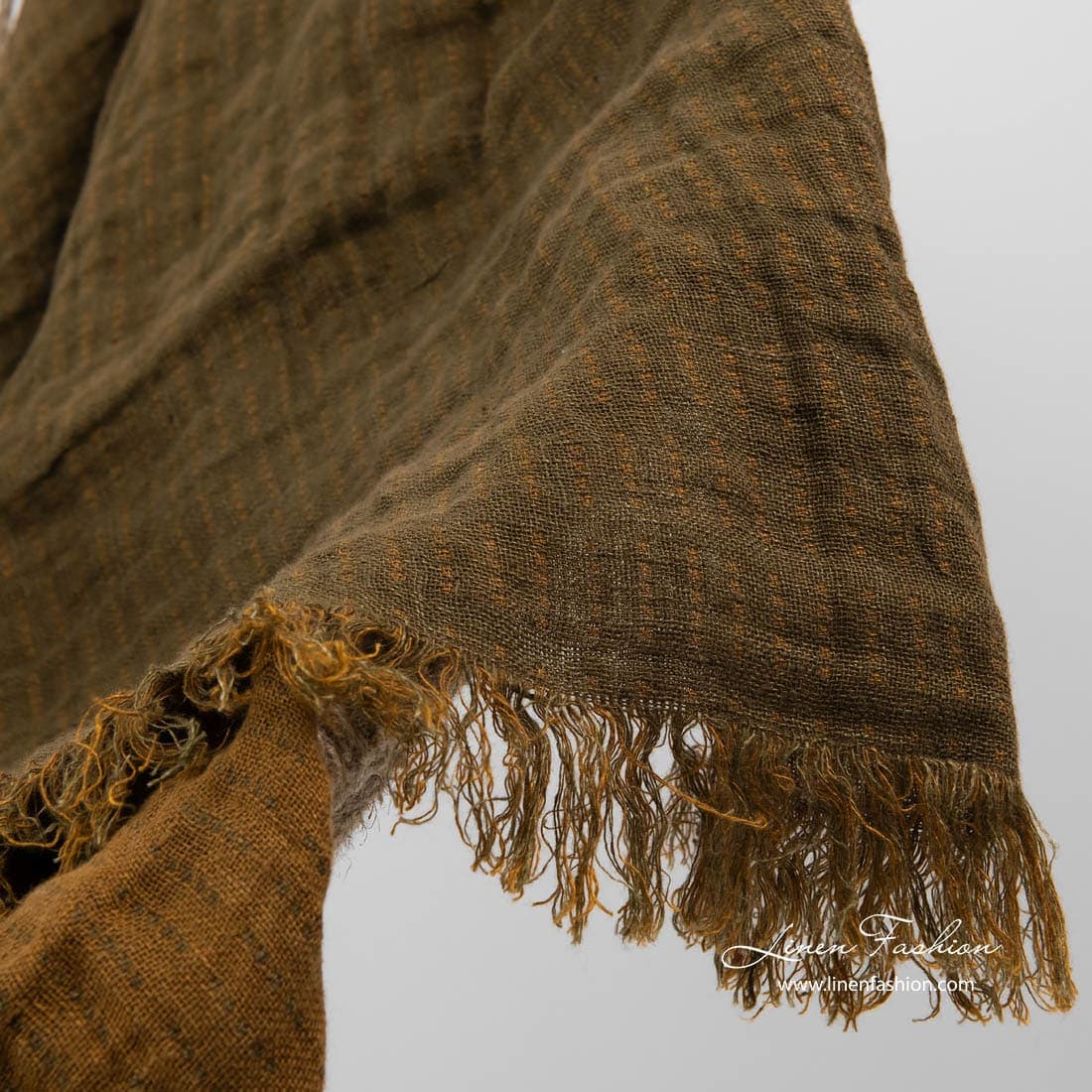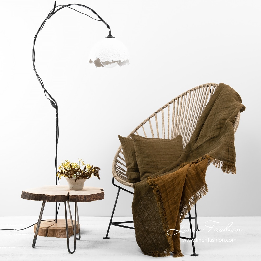 Mønstret tosidig 100% linpledd i mørk gråbrun og brunt sukker farger, dekorert med brune 5cm (2) lange frynser på kortsidene. Pleddet har ingen vrangside – begge sider vil se flotte ut over sengen eller pakket rundt deg. Det har et lite stiplemønster: lysebrunt mot mørkebrunt på den ene siden og mørkebrunt mot lysebrunt på den andre. Ekstra mykt og krympefritt på grunn av en spesiell vask i produksjonsprosessen. Et lunt og mykt tilbehør som ser fantastisk ut på sengen og er utrolig mykt å kose seg i. En flott gaveidé.