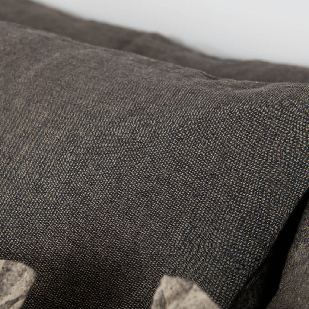 Mørkegrå sengetøykolleksjon BORA er laget av svart og brungrå melert lin-bomullsstoff. Alle artikler er spesialvasket for å gjøre dem myke, milde og krympebestandige. Dette sengetøyet er ment for de som elsker mørke farger.