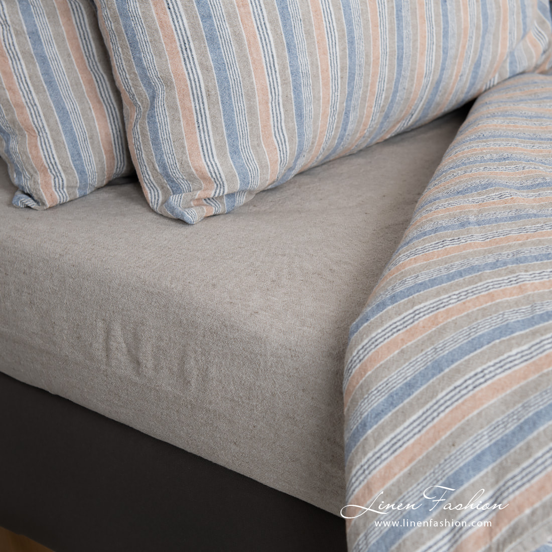 - Mønster: ensfargede melerte laken; stripete dynetrekk og putetrekk