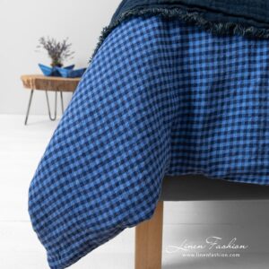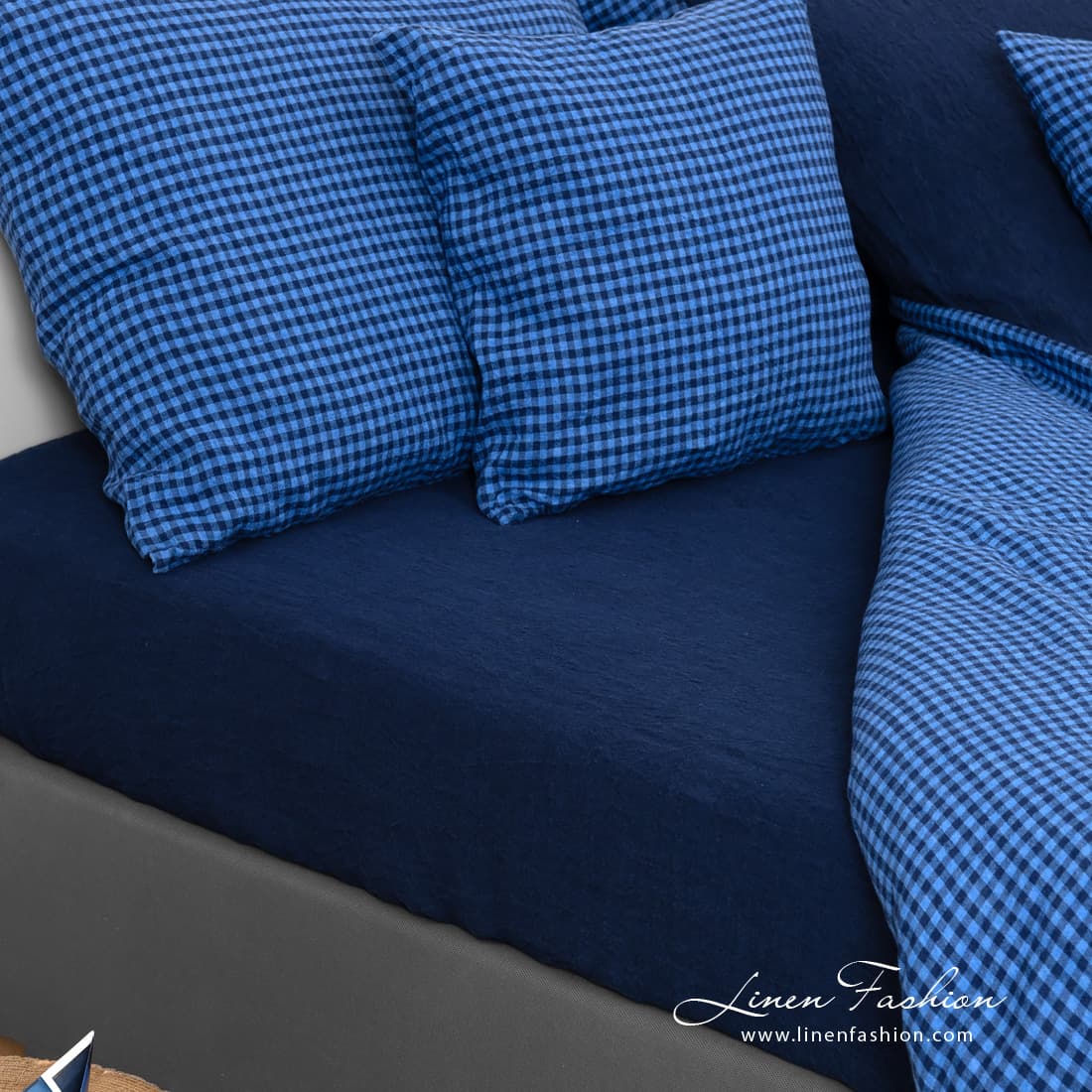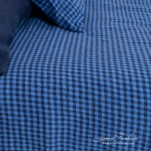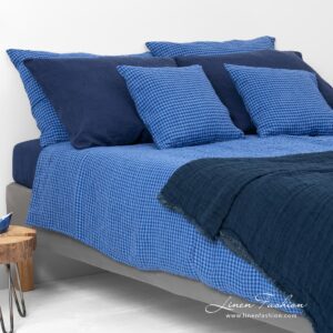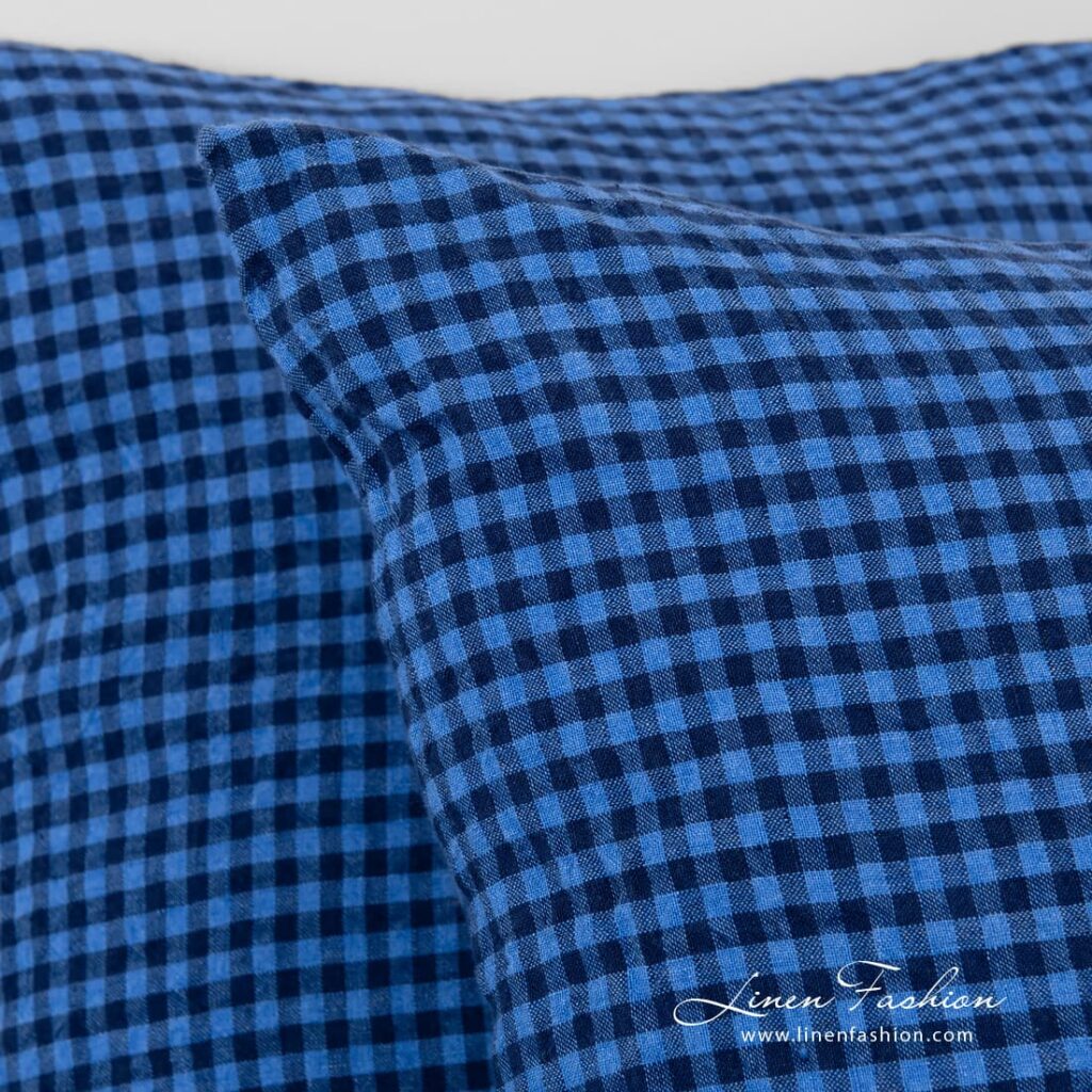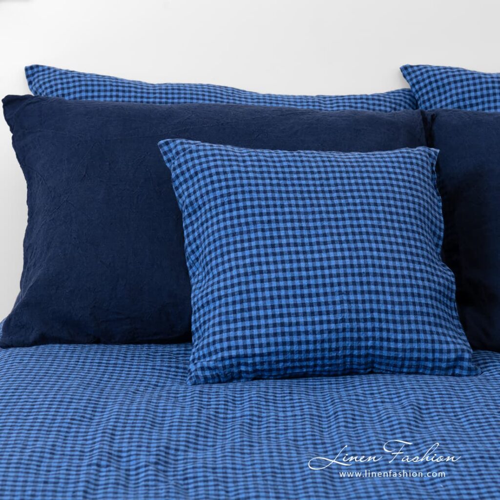 - Mønster: ensfarget melerte laken; rutete dynetrekk og putetrekk