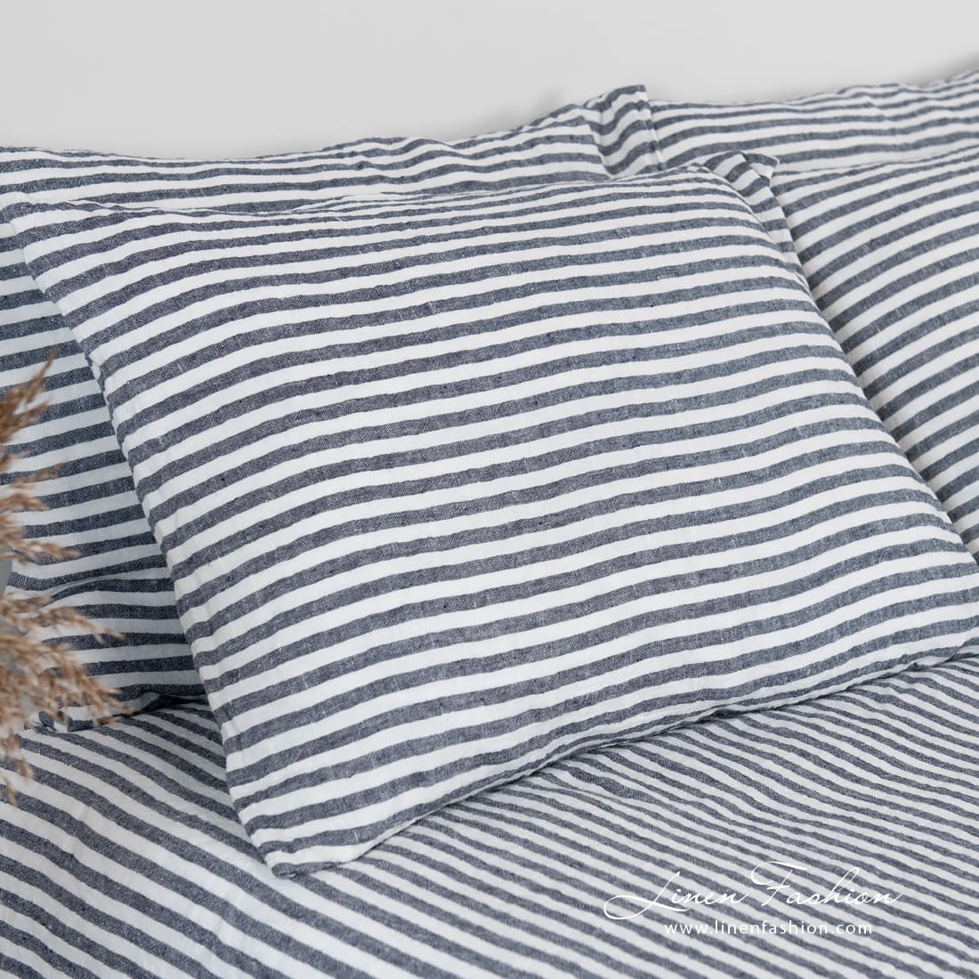 - Mønster: ensfargede hvite laken; stripete dynetrekk og putevar
