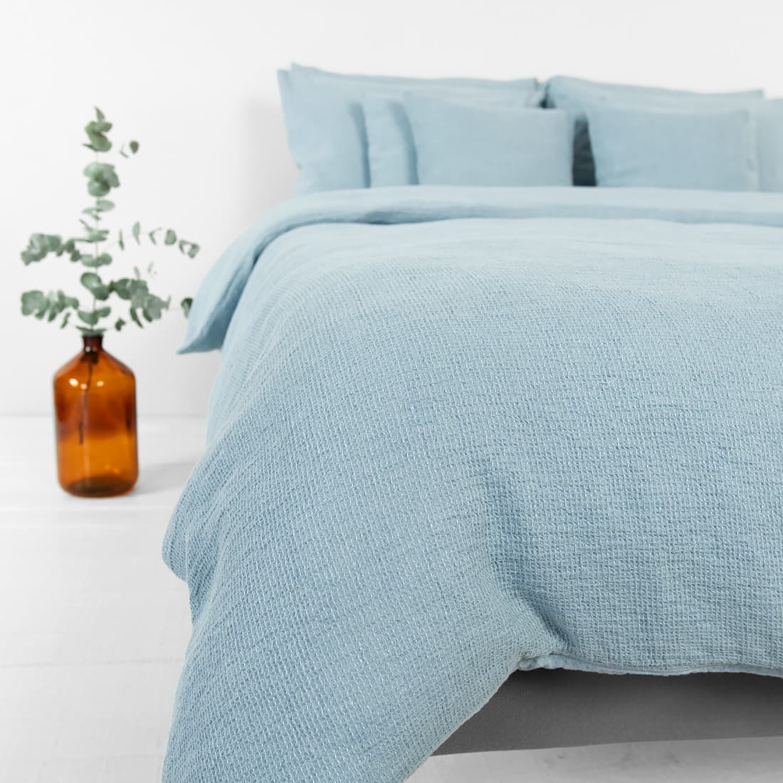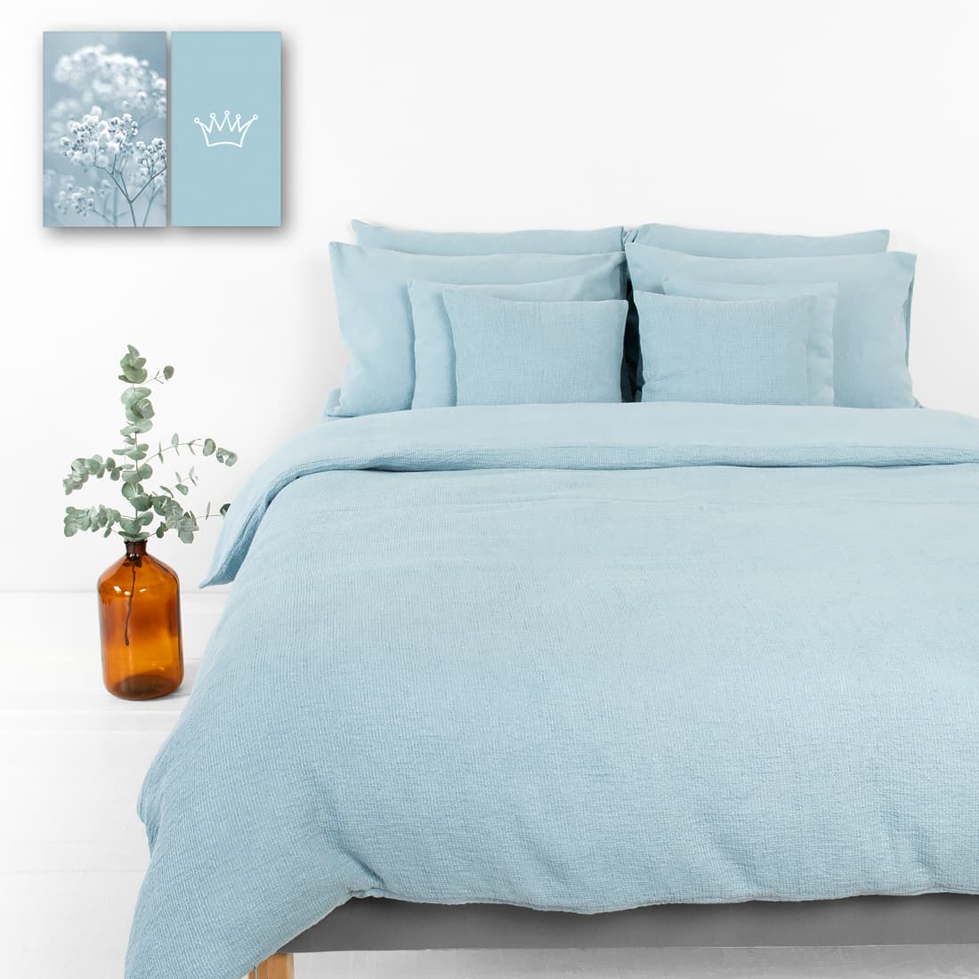 - Mønster: ensfargede laken og putevar; tosidige ensfargede/vaffelvevde dynetrekk