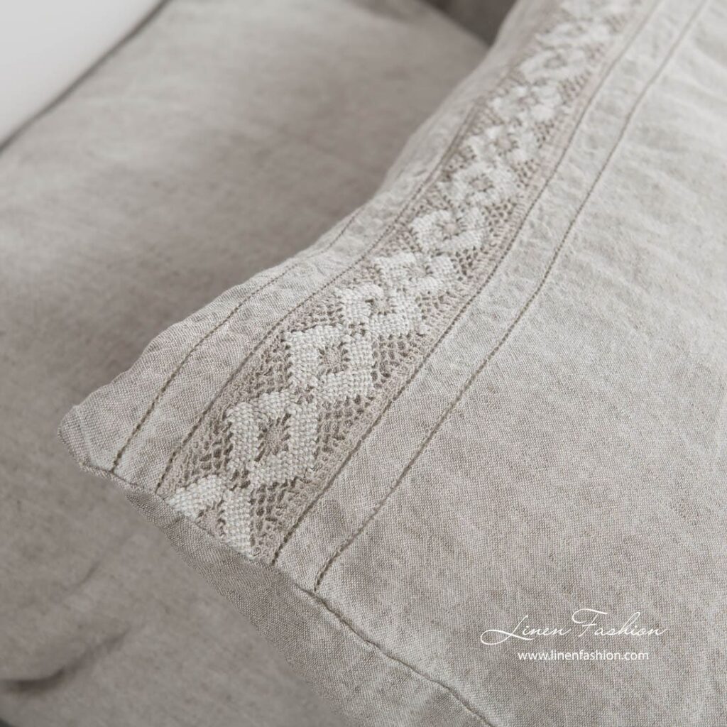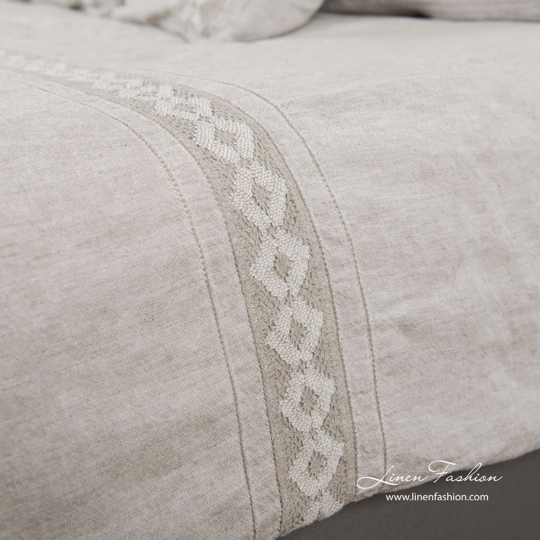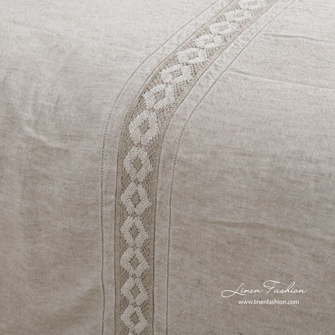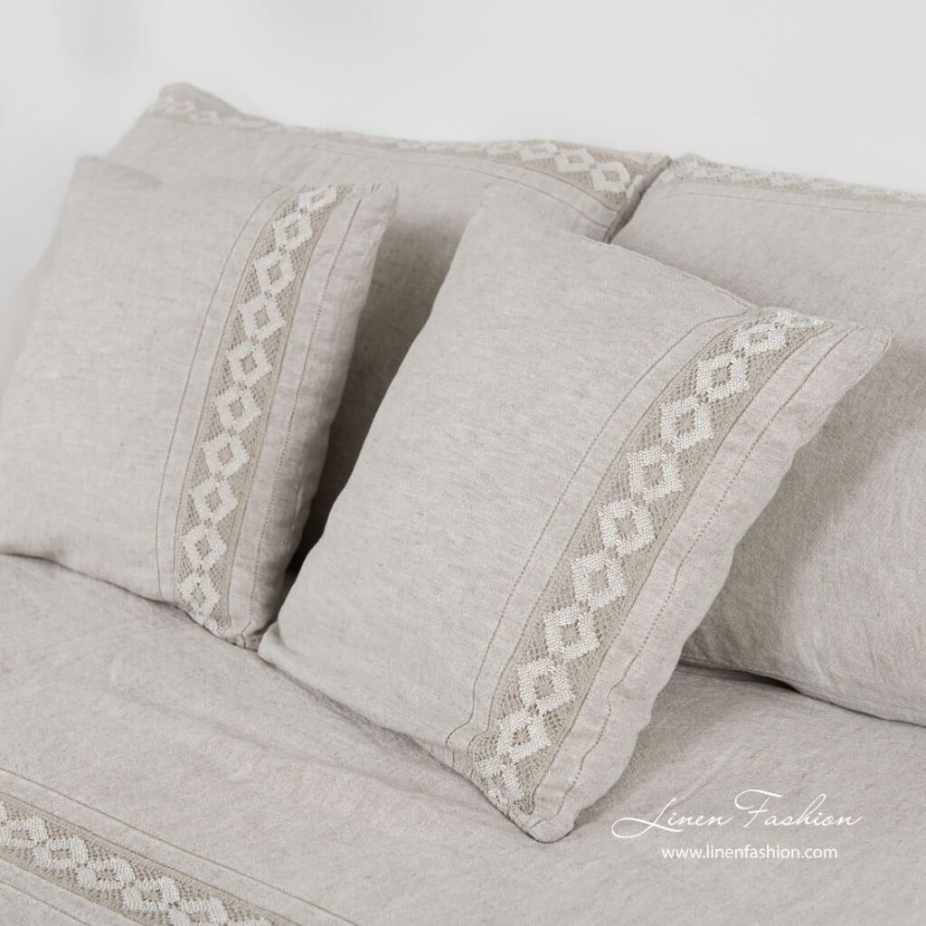 - Mønster: glattvevd med dekorative striper av åpenvevde blonder på trekk og puter