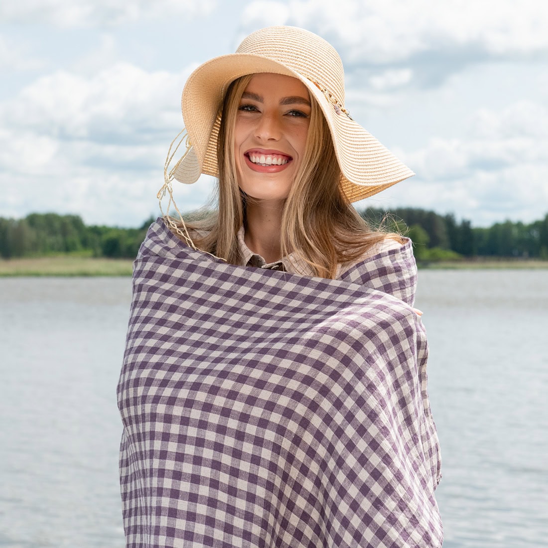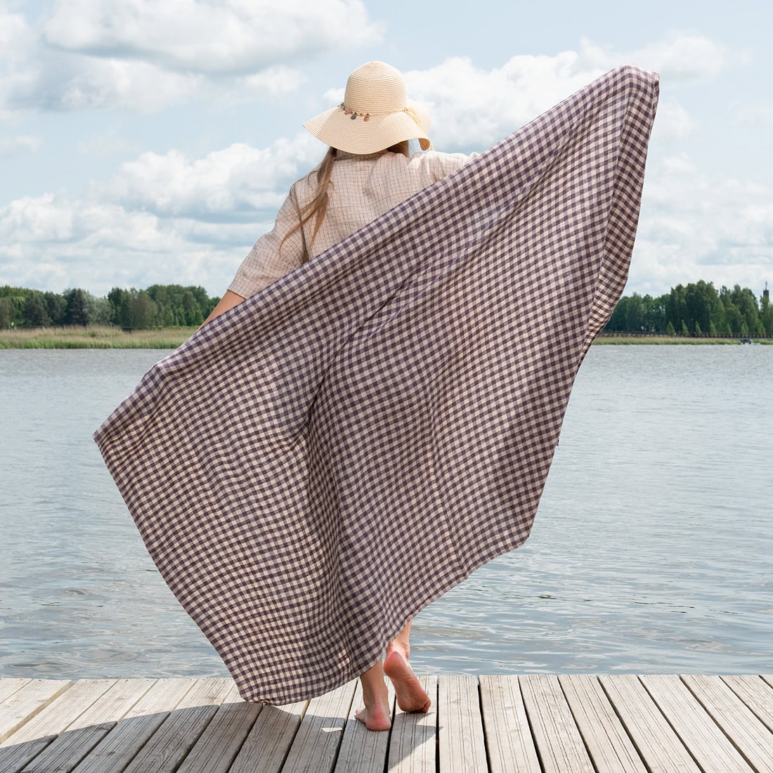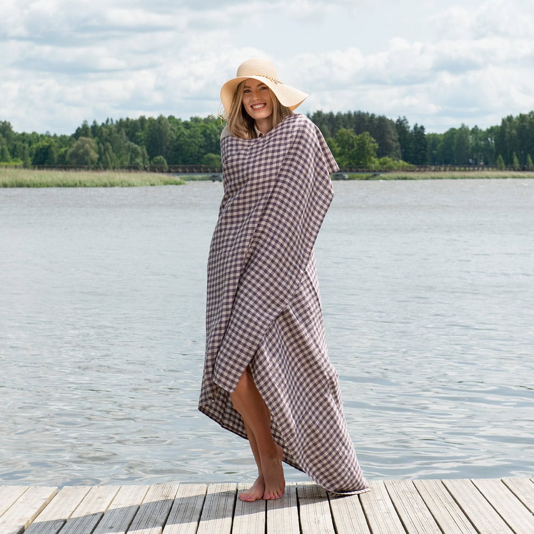 Strandhåndkle i lin med lilla ruter. Grå ruter ble vevd fra ufarget, naturlig lingarn. Dette håndkleet er lett, komfortabelt, tar ikke mye plass, absorberer fuktighet veldig godt og ikke minst tørker fort. Produktet ble spesielt vasket som gjør det ekstremt mykt og skånsomt.