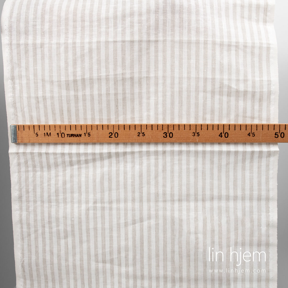 Stripete linstoff i grå farge vevd fra melkehvite og ufarget lingarn. Vertikale striper på 7mm. Stoffet er tettvevd, middels tykkelse, passer perfekt til å sy kjøkkenhåndklær fordi stoffet absorberer fuktighet veldig godt.