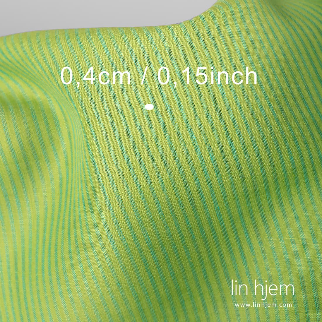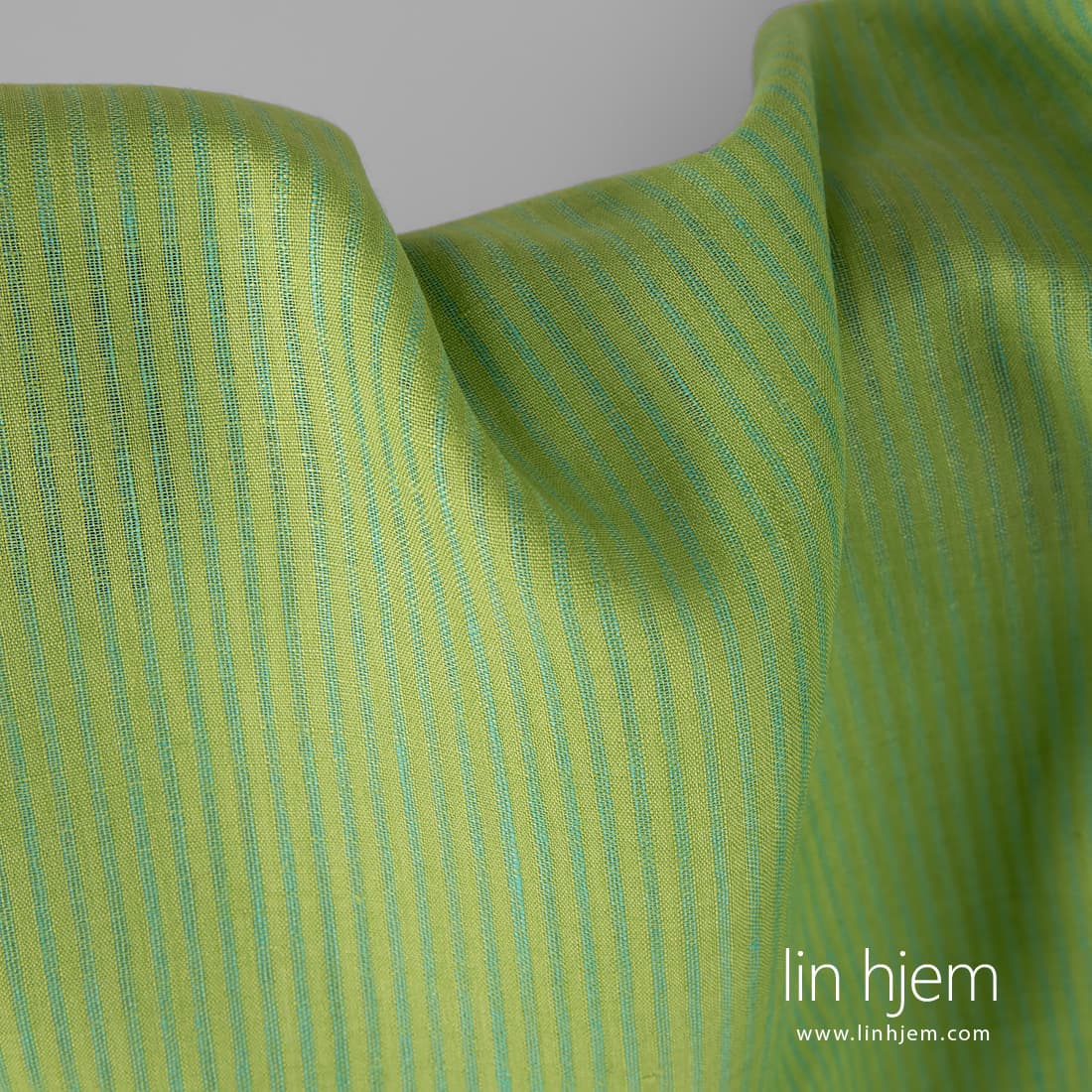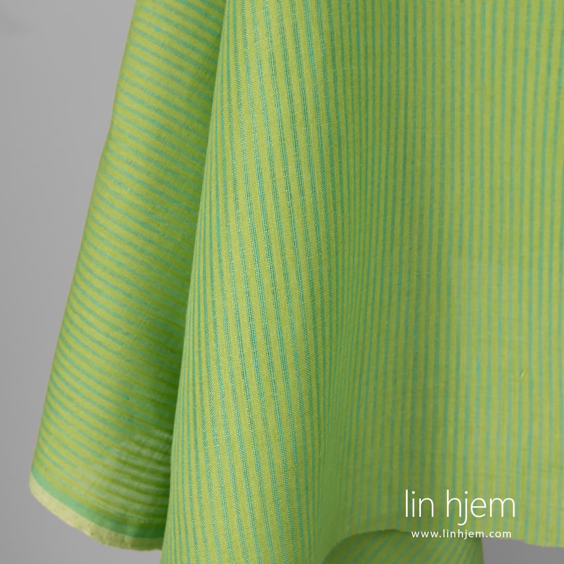 Stripete lysegrønt linstoff. Vertikale løstvevde turkis farget striper. Holdbart, middels tykkelse stoff som passer til å sy klær og hjem tekstil produkter.