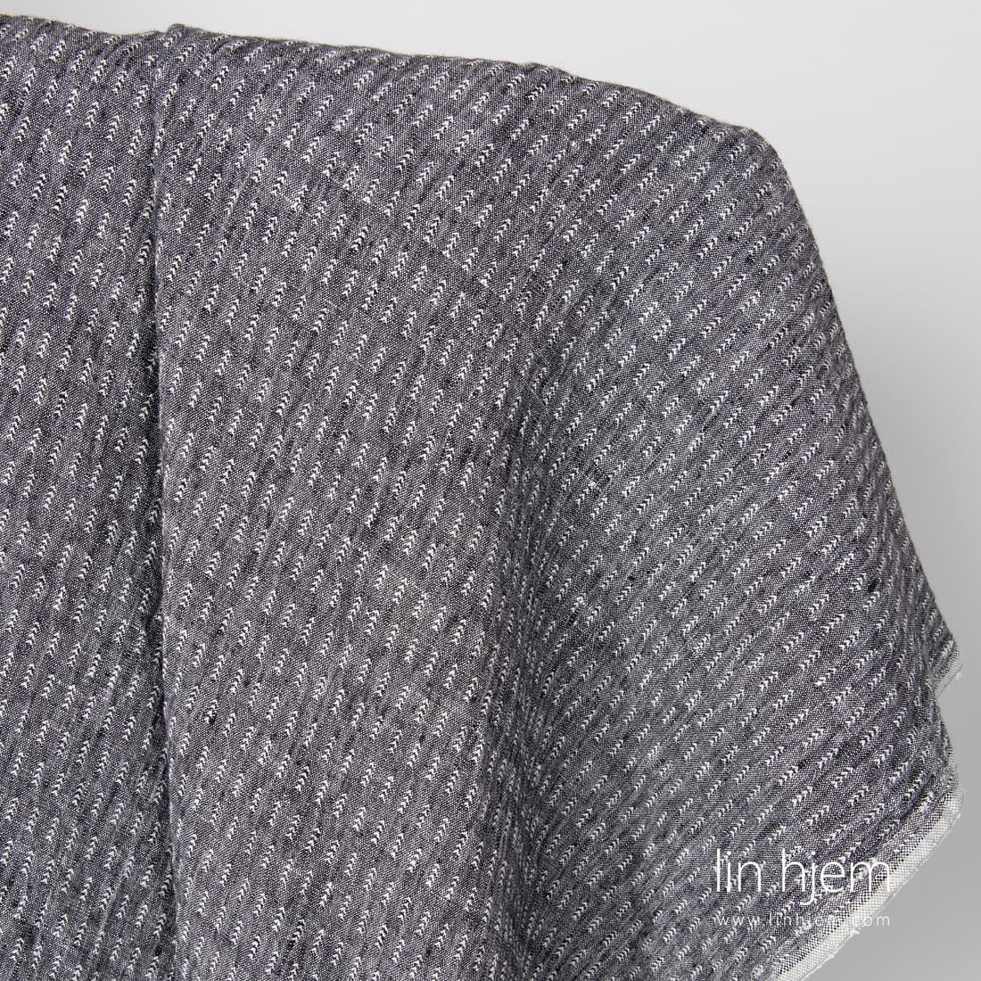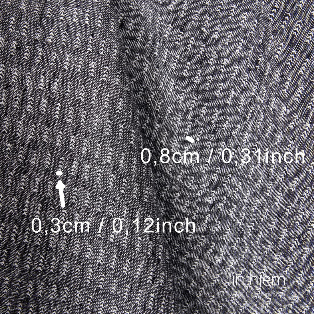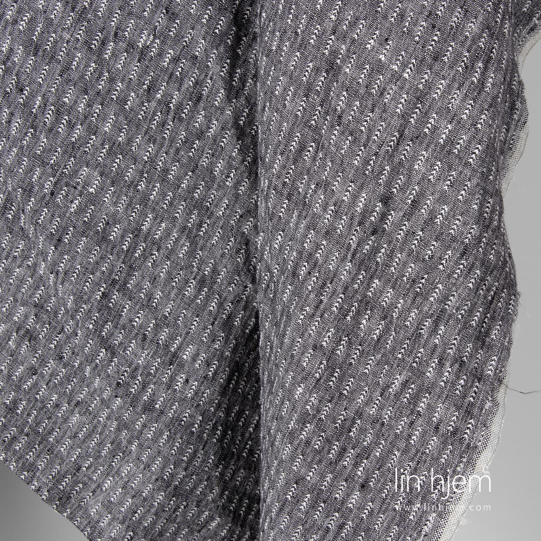 Svart/hvitt mønstret vasket linstoff. Hvite graner på svart melange bakgrunn. Stoffet er holdbart, tettvevd, middels tykkelse. Spesielt vasket som gjør stoffet mykt og skånsomt, reduserer krymping.