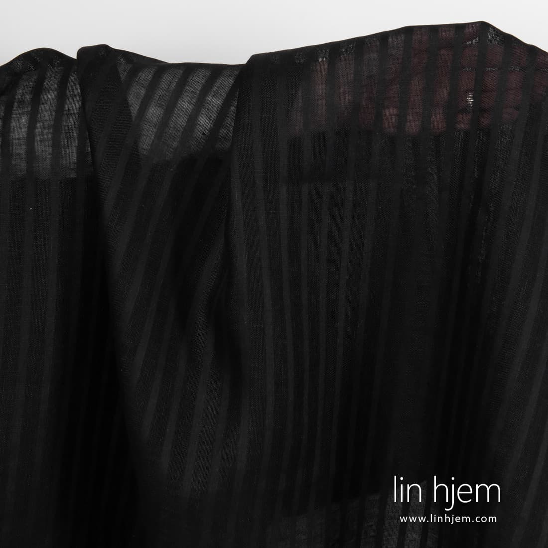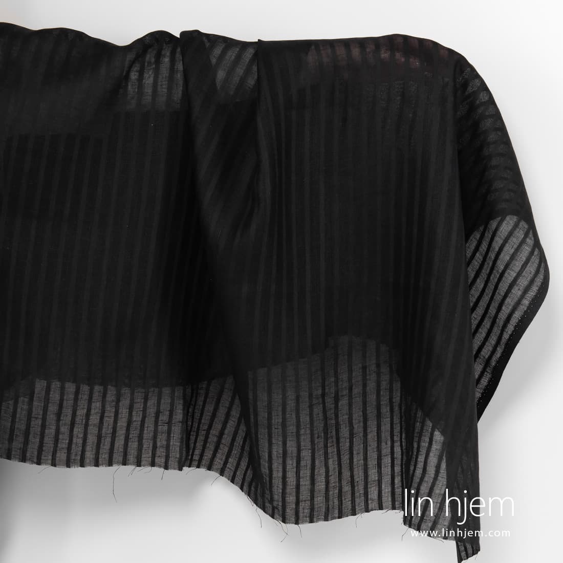 Svart linstoff med gjennomsiktige vertikale striper. Dette stoffet er lett derfor passer perfekt til å sy gardiner, skjerf.